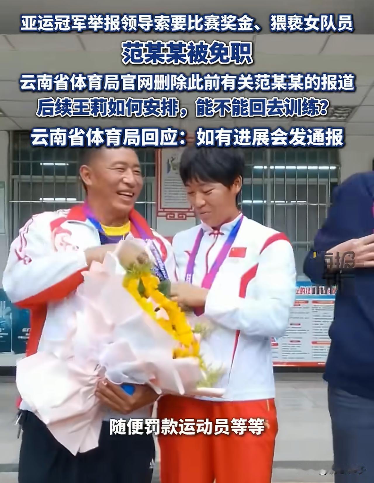 云南皮划艇队的范教练,终于被立案调查了[赞]! 2025年的12月,皮划艇运动员王莉,实名对范教练进行举报,并公开范教练诸多问题[机智]。 王莉说23年亚运会,她拿下龙舟比赛的三块金牌。但却被范教练索要15万奖金[震惊]。 当她拒绝后,范教练就开始打压报复。王莉还说这个范教练,随意克扣她们工资。时常猥亵队里女队员[what],甚至让他的老婆吃空饷。 2026年1月11日,云南体育局删了范教练的39篇报道[鼓掌]。现在看免职只是前菜,估计他要"踩缝纫机"了[笑哭]! 当初多狂现在就多凉,这个年他是过不上了[机智]!范教练现已被立案调查中。对于此事你怎么看?评论区说下你的看法吧。