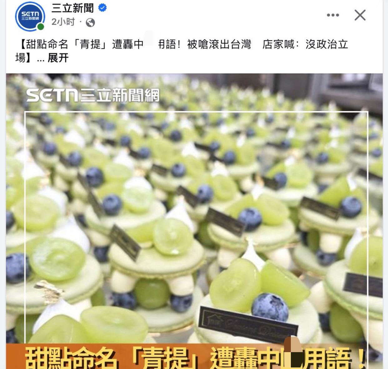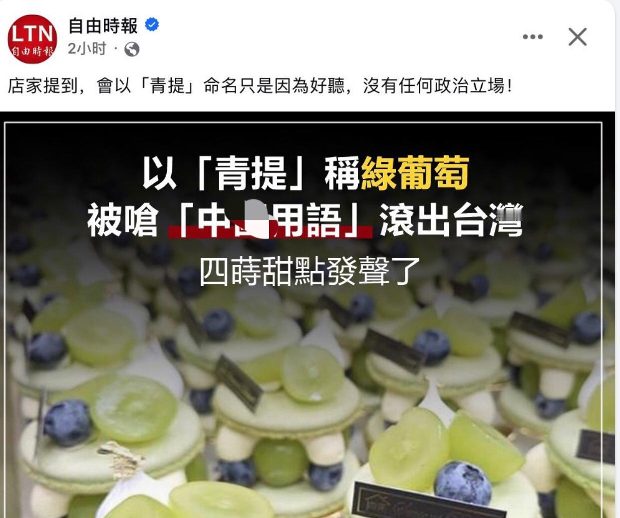 台媒称,台湾“四时甜点”店因用“青提”称呼“绿葡萄”,被指使用大陆用语,遭呛滚出台湾。 店家对此表示,会以“青提”命名,纯粹只是为了好听,并不持有任何政治立场。