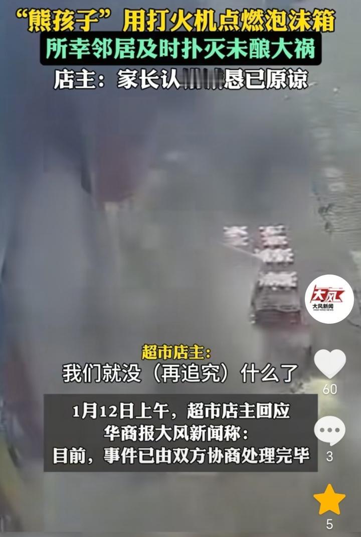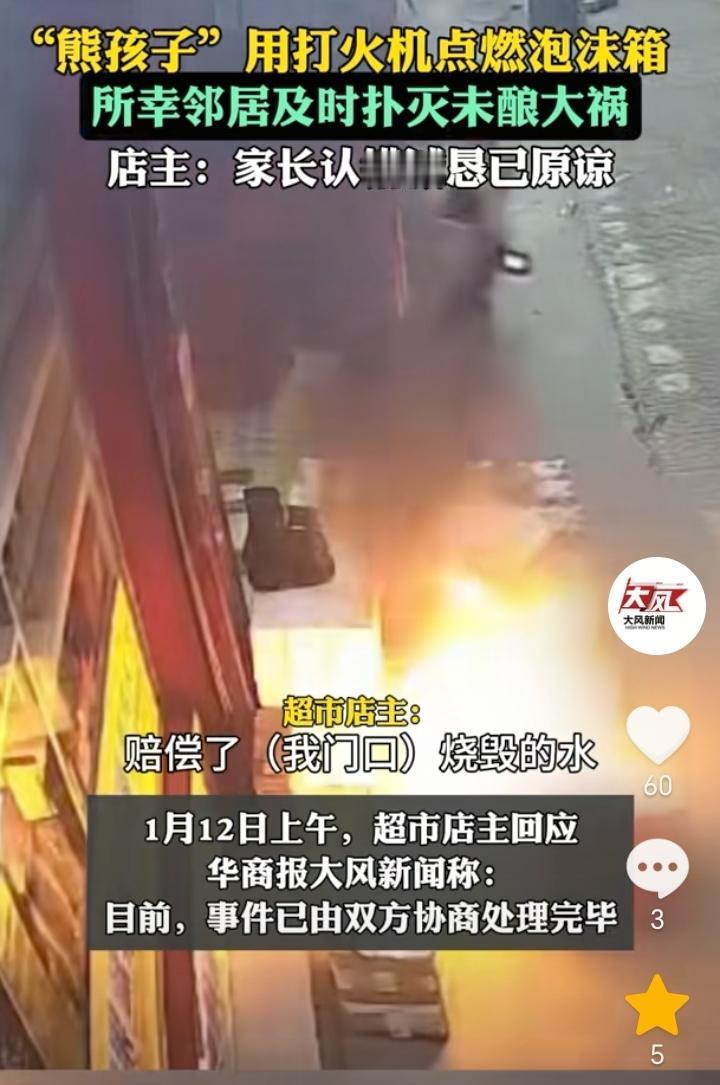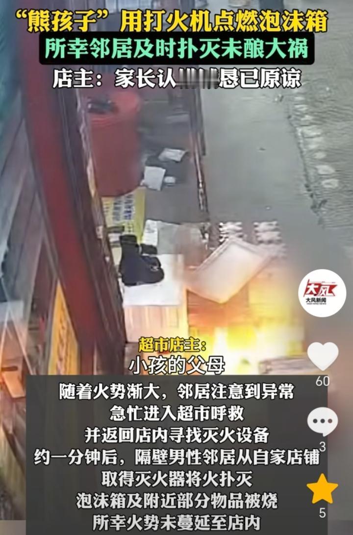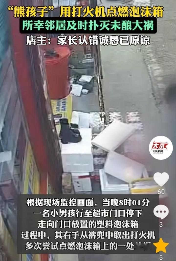 “熊孩子”!湖南,一超市门口发生了一起火情,监控显示,一名小男孩路过超市的时候从兜里掏出了打火机,多次尝试点燃了泡沫箱上的一处盖板,开始的时候火苗小没有人察觉到,直到有明显火光和黑烟邻居发现异常后,急忙进超市呼救,然后返回拿灭火器才把火扑灭。店主表示,小孩家长道歉诚恳也赔偿了,并教育了孩子,所以选择了原谅。 这熊孩子也是太坏了,无缘无故用打火机去点人家超市门口东西,要不是邻居发现及时,可能整个超市都会被烧。 俗话说“子不教,父子过”,孩子能这么坏,主要还是父母没有教育好,不过有因必有果,没有教育好孩子,孩子闯祸了还的父母去给说好话赔偿。 这次店主也是看在家长道歉诚恳,并赔偿的份上选择了原谅,如果孩子再闯祸那就没有这样的好运了,所以家长一定要好好的教育孩子,避免孩子再次闯祸。