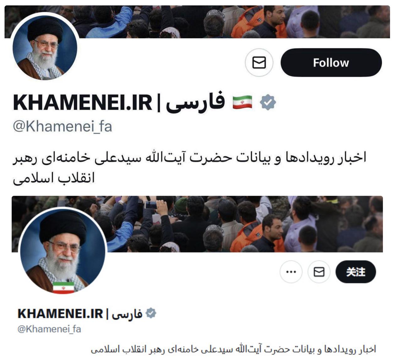 来了,来了,马斯克露出了狐狸尾巴。 在伊朗进行网络管控之后,马斯克的星链开始为伊朗提供网络服务。马斯克的算盘刚拨动,就发现了一个奇特的现象。 星链在伊朗根本不管用。网速跟拨号差不多,几乎等于无法上网。 估计马斯克也纳闷,伊朗的网络技术远超他的想象。 另外,除了星链,马斯克的X平台,居然把伊朗的国旗,换成了阿列维王朝时期的国旗。但是奇怪的是,X平台却又允许哈梅内伊修改头像。 看一下图二,上面是之前的头像,下面是修改后的。 感觉X平台也很纠结。