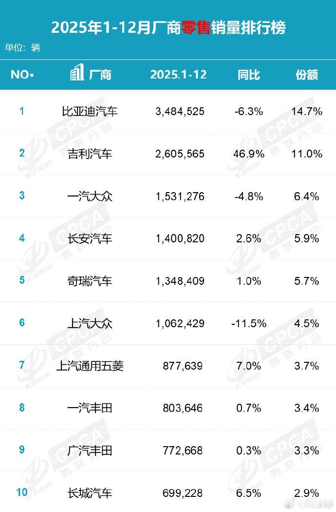 国产车包揽前五席,合资品牌遭遇份额挤压 看了乘联会2025年的销量榜,感触挺深的。前十名里国产品牌占了八席,前五名更是直接包揽了四席。比亚迪以超过348万辆的销量断层第一,吉利以近47%的惊人增速冲到第二。这个格局放在几年前,真是不敢想。 数据背后,是市场逻辑的根本转变。像比亚迪、吉利、长安这些国产品牌,在新能源和智能化上押对了宝,产品力上来了,消费者自然用脚投票。反观多数合资品牌,榜单上增速乏力甚至下滑,转型的包袱看来不小。车市这场“换轨”竞争,主动权已经易手了。【来自懂车帝车友圈】