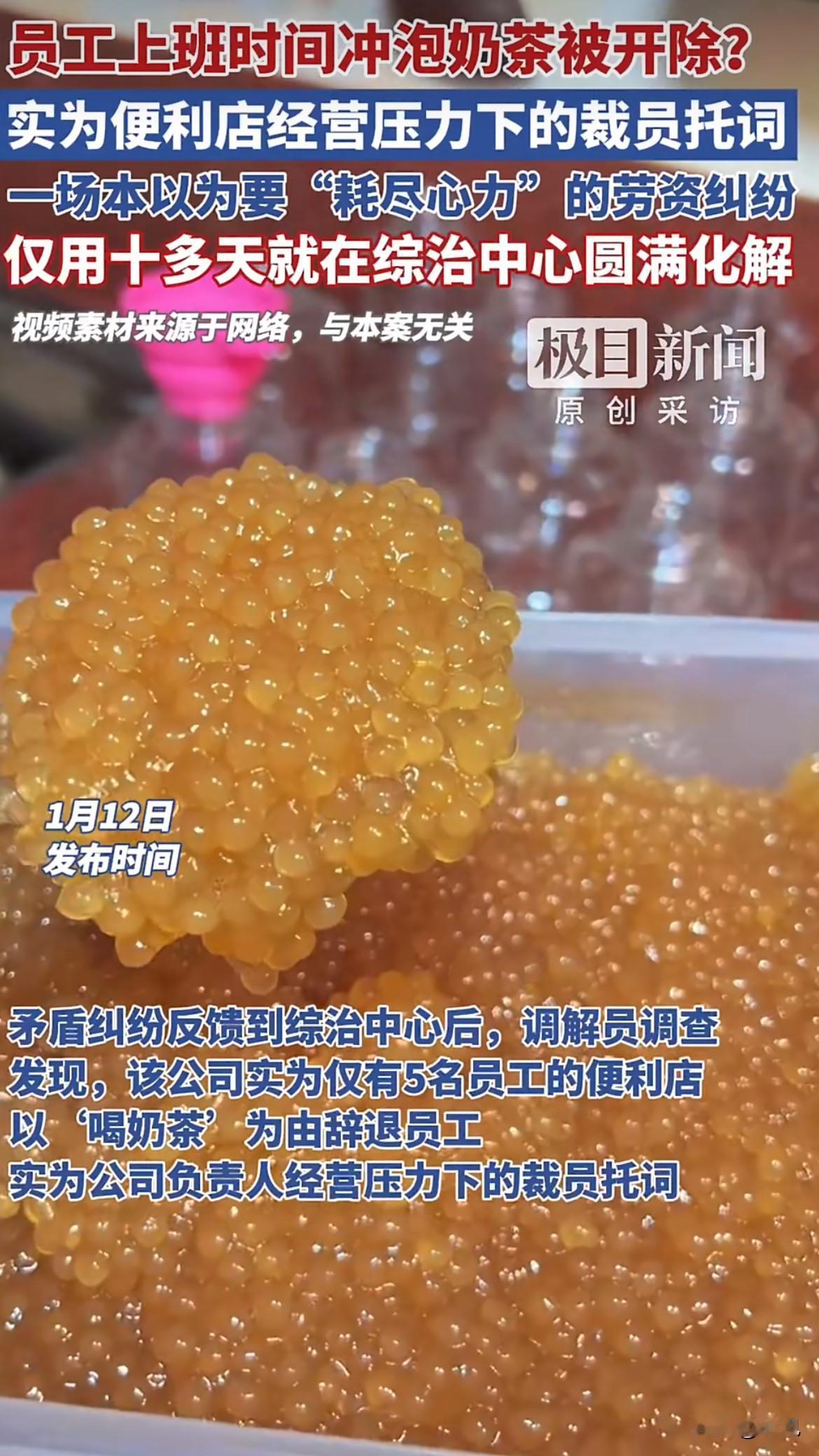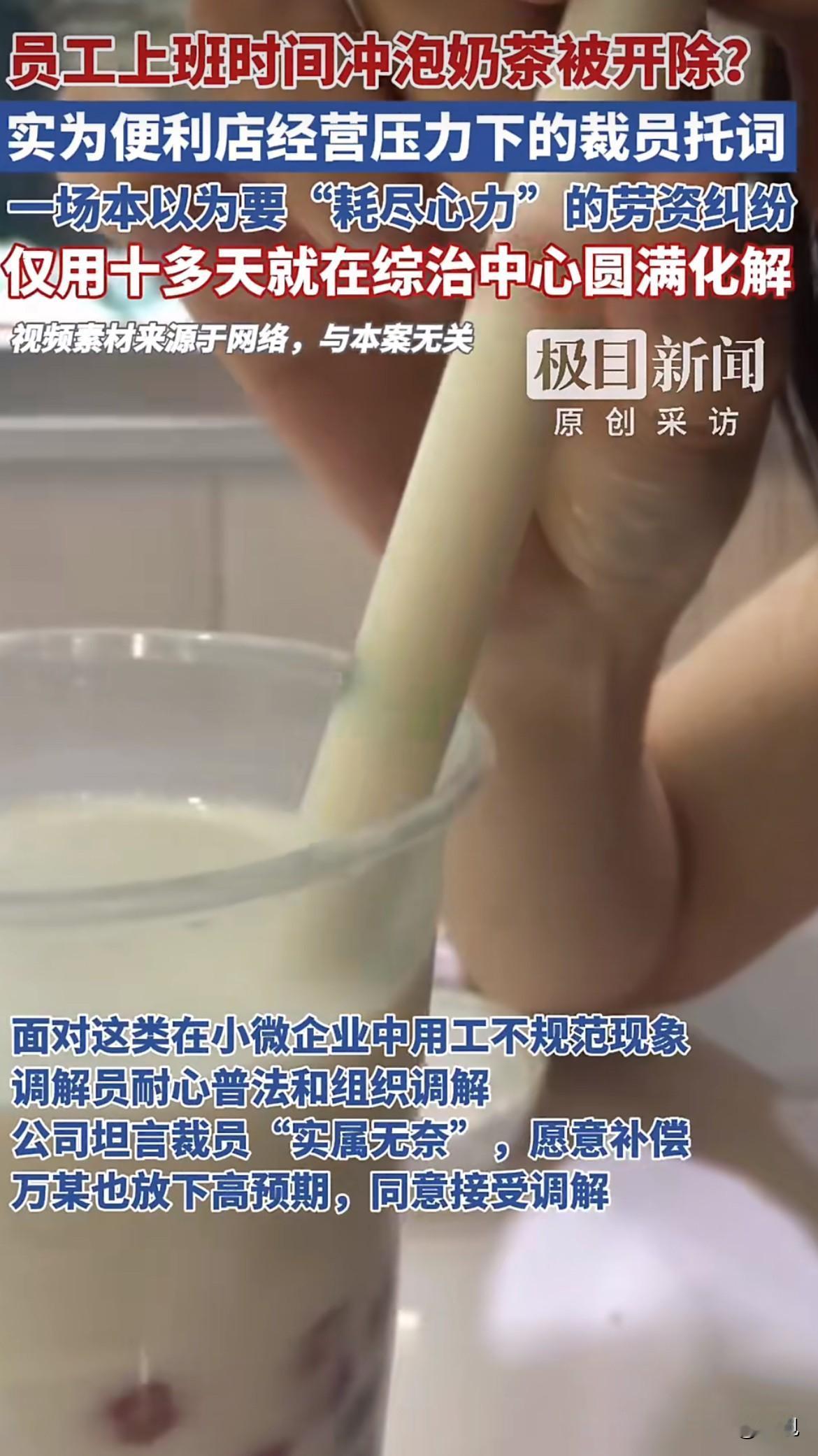 47岁女员工上班冲泡奶茶被辞退,这理由你敢信? 干了四年没签合同,公司说辞就辞。万某这心里拔凉拔凉的,一杯奶茶成了丢工作的借口?她决定硬刚到底,算清账,要公司赔偿一万七。 一查才知道,哪是什么奶茶问题。公司就一5人小便利店,经营不下去了,想裁人又不想依法给补偿,随手抓个理由当遮羞布。 调解员两头说话。跟老板讲法律:裁员可以,但得按规矩来,别整这些荒唐事。跟万某讲现实:工作满一年,法律上就算无固定期限合同了,有些钱确实难要到。 说白了,小老板也有难处,但这不是侵犯员工权益的理由。万某也明白了,耗下去时间成本太高。最后各退一步,公司当场给钱,万某撤诉,好聚好散。 这事看着小,背后是大问题。多少小微企业用工一塌糊涂,不签合同、随意开除,员工尤其是中年员工,永远是弱势一方。一杯奶茶,照出了多少打工人的无奈。