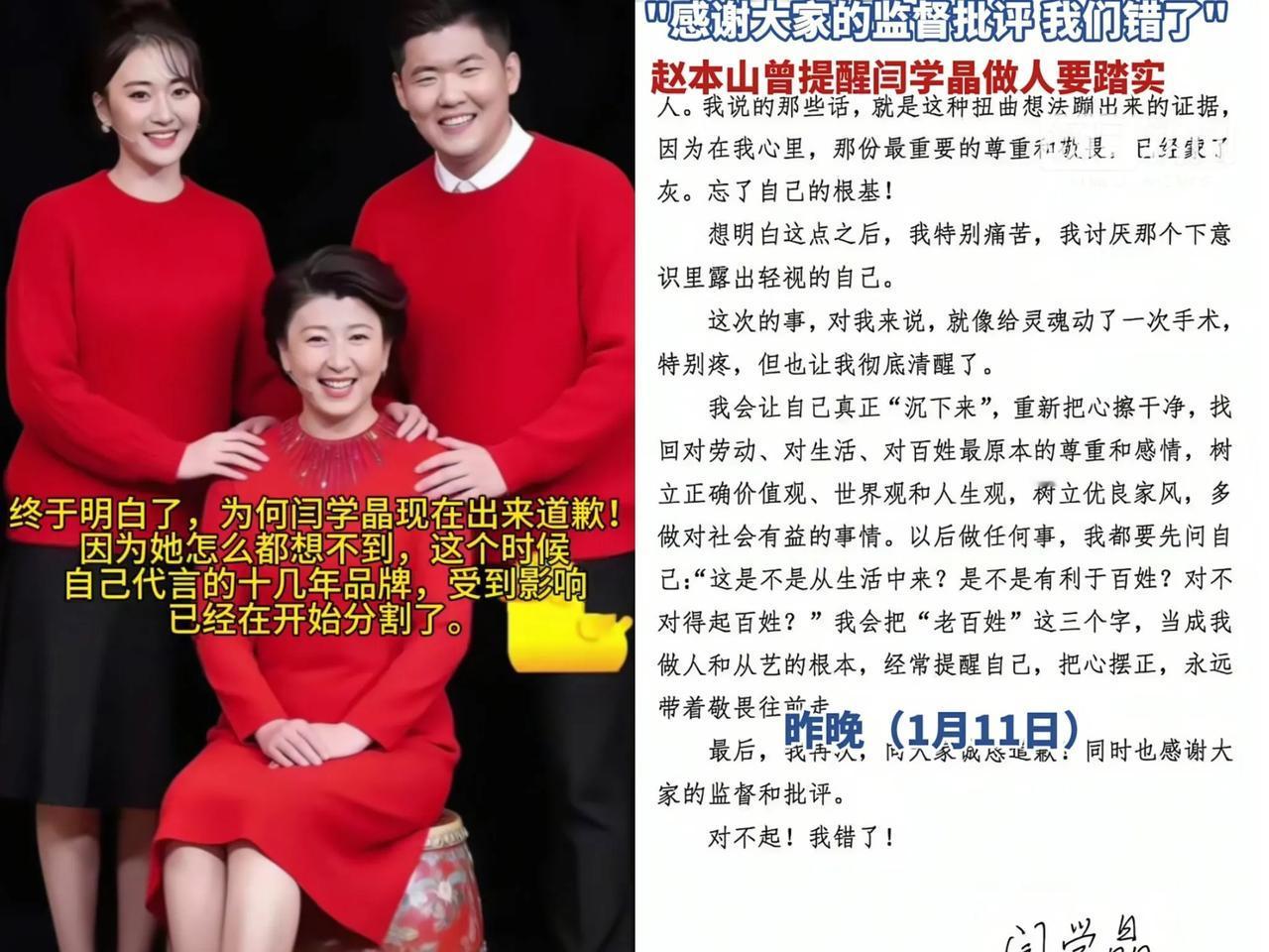 终于明白了, 为何闫学晶现在出来道歉! 因为她怎么都想不到,自己代言十几年的品牌,就这么受影响开始“闹分家”了! 没品牌方发声明终止合作,她哪会轻易低头道歉啊。这不,佐香园和统厨说撤就撤,对她打击可不小! 她这次向粉丝道歉,明显是经济受冲击,形象代言也快没了,没办法才低头! 这事儿告诉咱,明星可不能小瞧粉丝! 然而这一次的教训也许会让她这辈子终生难忘,粉丝和大众才是你们演员的衣食父母,这是必然的,骂粉丝就是断自己财路,经过这次事情以后她应该乖了吧! 大家觉得她是真心悔过,还是迫于无奈呢?