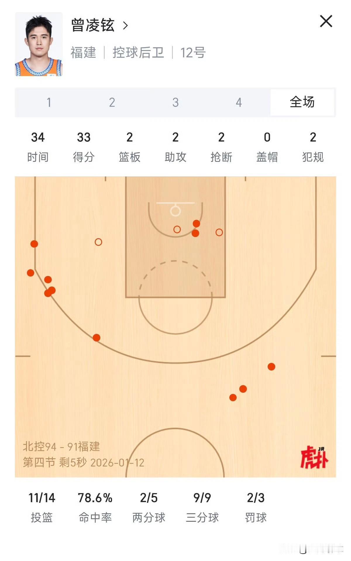 “有朝一日龙抬头,定要黄河水倒流,待到龙啸凌云日,不负平生少年志”福建小将曾凌铉单场9记三分全中轰33分,创CBA历史神迹却无奈空砍!曾凌铉本场开启“三分暴走模式”,全场14投11中,三分球9投全中,狂砍33分2篮板2助攻2抢断,成为CBA历史上首位单场至少出手9次三分且命中率100%的球员,这一表现足以载入联赛史册。遗憾的是,这样的封神表现没能帮助球队赢球,最终会被廖三宁三分一剑封喉绝杀比赛!