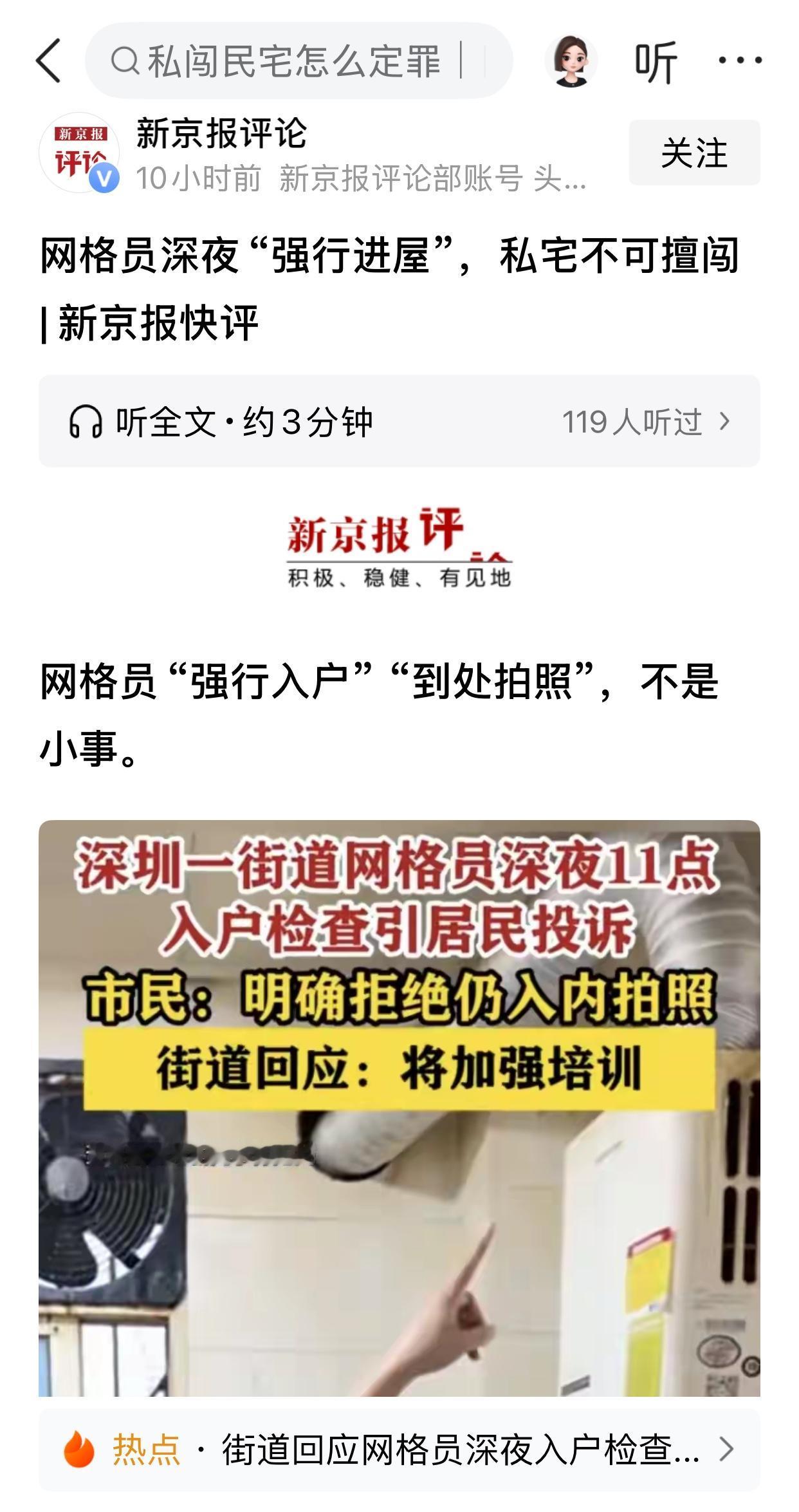 深圳网格员深夜“强行进屋”。 之前我一直以为,网格员是一种类似于志愿者的工作人员,和以前的居委会大爷大妈一样,为维护社区环境而志愿服务人员。即使你是为社区服务,也不应该深夜“强行进屋”吧? 有人在评论区说:很多人没有做过基层工作,不清楚这部分工作人员的苦楚,上有领导压力,下易得罪民众,人们很容易误解他们。由于调查工作的性质,时间很受限制,他们休息时间上门也是迫不得已,请多点理解多点包容。 基层工作人员,确实是挺不容易的,希望大家多多支持吧。
