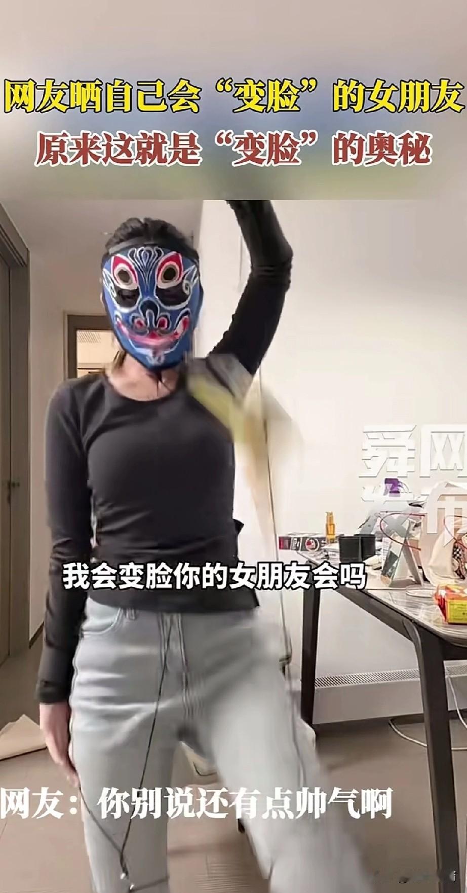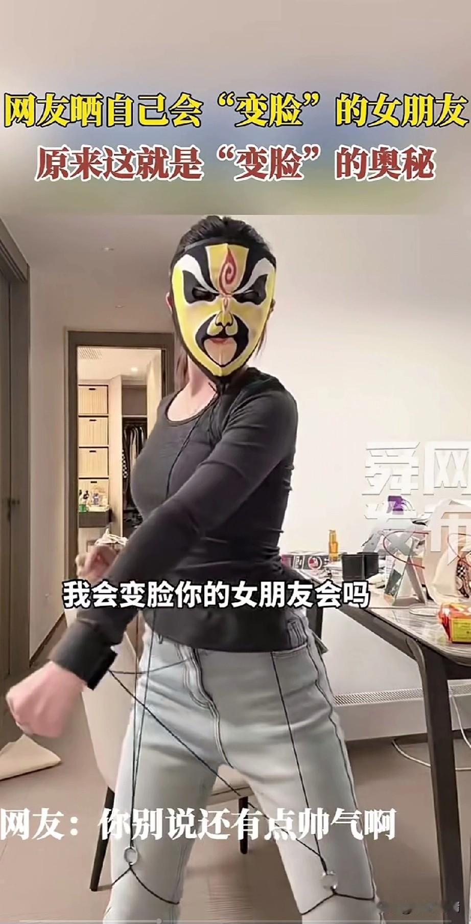 原来川剧中的变脸是这样的, 一男子晒出了自己会变脸的女朋友, 只见女子身上穿着各种绳子组成的机关,绳子上面连接着各种面具, 手中拉着两根绳子, 每次跟着动作拉动绳子, 脸上的面具就会换成下一张, 可以一边简单的跳舞表演, 一边的表演川剧片, 看的让人也觉得非常精彩, 为了川剧变脸的秘密,居然在这里, 几根绳子就可以了, 大家有兴趣的也可以试一试, 毕竟这样的表演确实很好玩, 网友表示你还别说, 这样的成绩变脸还真是有点儿帅, 大家觉得川剧的变脸简单吗? 变脸非遗演出 变脸传统艺术 成都变脸演出 自学川剧变脸 戏曲化川剧变脸