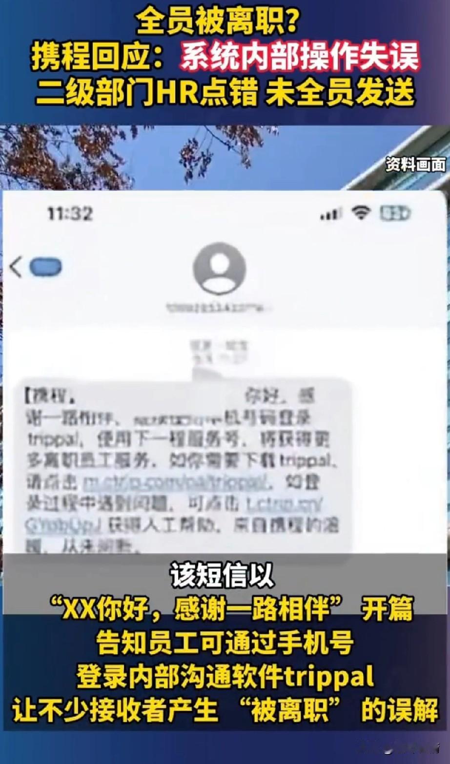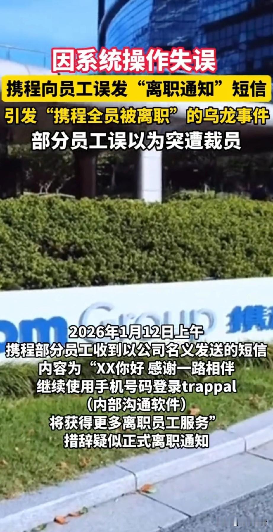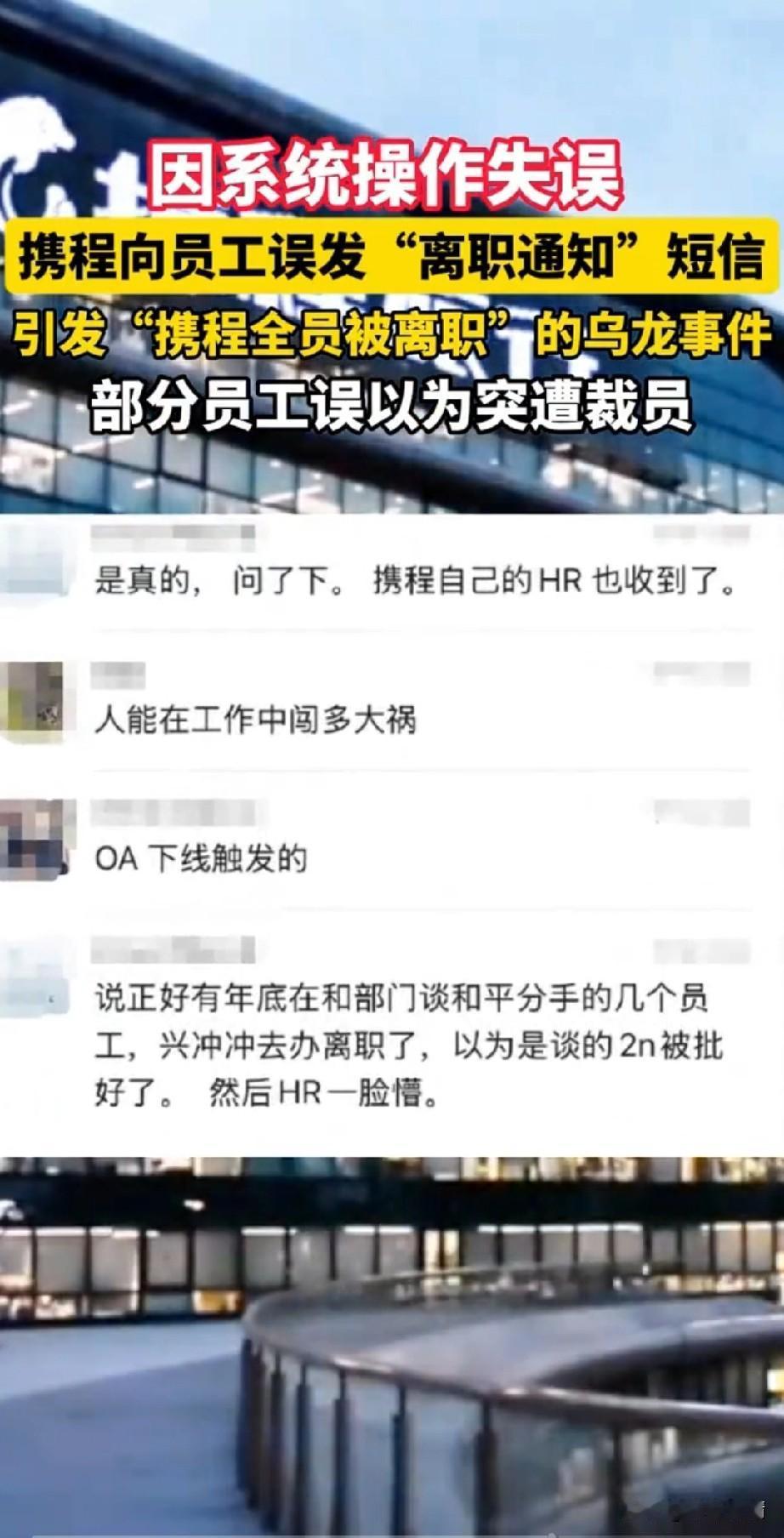 一觉醒来携程员工的天塌了, 以为公司就要解散了, 谁知道居然是2级HR误发! 这你敢信吗? 这可是互联网大厂的HR, 事后公司赶紧发布了澄清, 要不然整个公司就完了, HR发布的信息是离职标准模板, 事后公司给这名HR放了一天假, 让她去平复心情一下, 这简直听起来离谱, 不应该给被发离职短信的员工放假一天吗?受到惊吓的应该是这些员工, 明明前一天还在努力工作, 第二天早上直接收到了被离职的短信, 当时的心情可想而知, 就算公司倒闭也不能这么快吧! 这可毕竟是携程呀! 网友调侃道人在紧张的时候能犯多大的错?看看携程HR就知道了! 还有网友表示弄垮一个公司是多么的容易,只需要HR发布一则离职的短信就可以!恐怕携程这次HR误发短信事件, 日后将要被作为HR行业的典型案例了! 大家觉得携程HR误发离职短信这事好玩吗? 携程乱象 携程旅行公司 携程投诉 携程集团 客人的携程评价