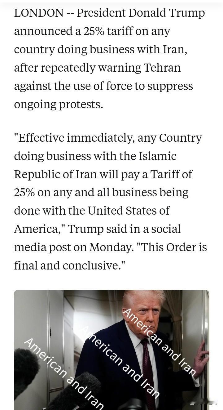 川普宣布:即日起,任何与伊朗现政府有生意往来的国家,一切对美贸易加征25%的关税,立即生效。 ⚠️:美国务院警告在伊朗的美国公民立刻离开。[震惊] 🤔 伊朗要有好果子吃了,等着瞧吧。 @头条号 @今日头条 伊朗这事全世界都在看,你以为你们限制了我别人就看不到了?又坏又蠢的东西。 伊朗