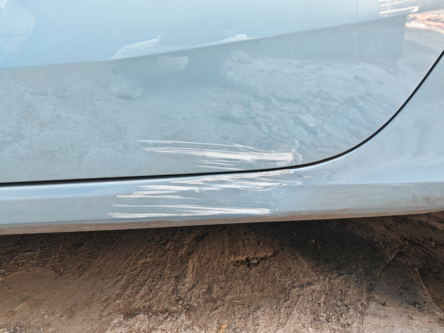 干水泥疙瘩上了请问应该怎么修 蹭到水泥疙瘩上了,请问大家这个应该怎么修?多少价格?外观无所谓,就想保障别生锈