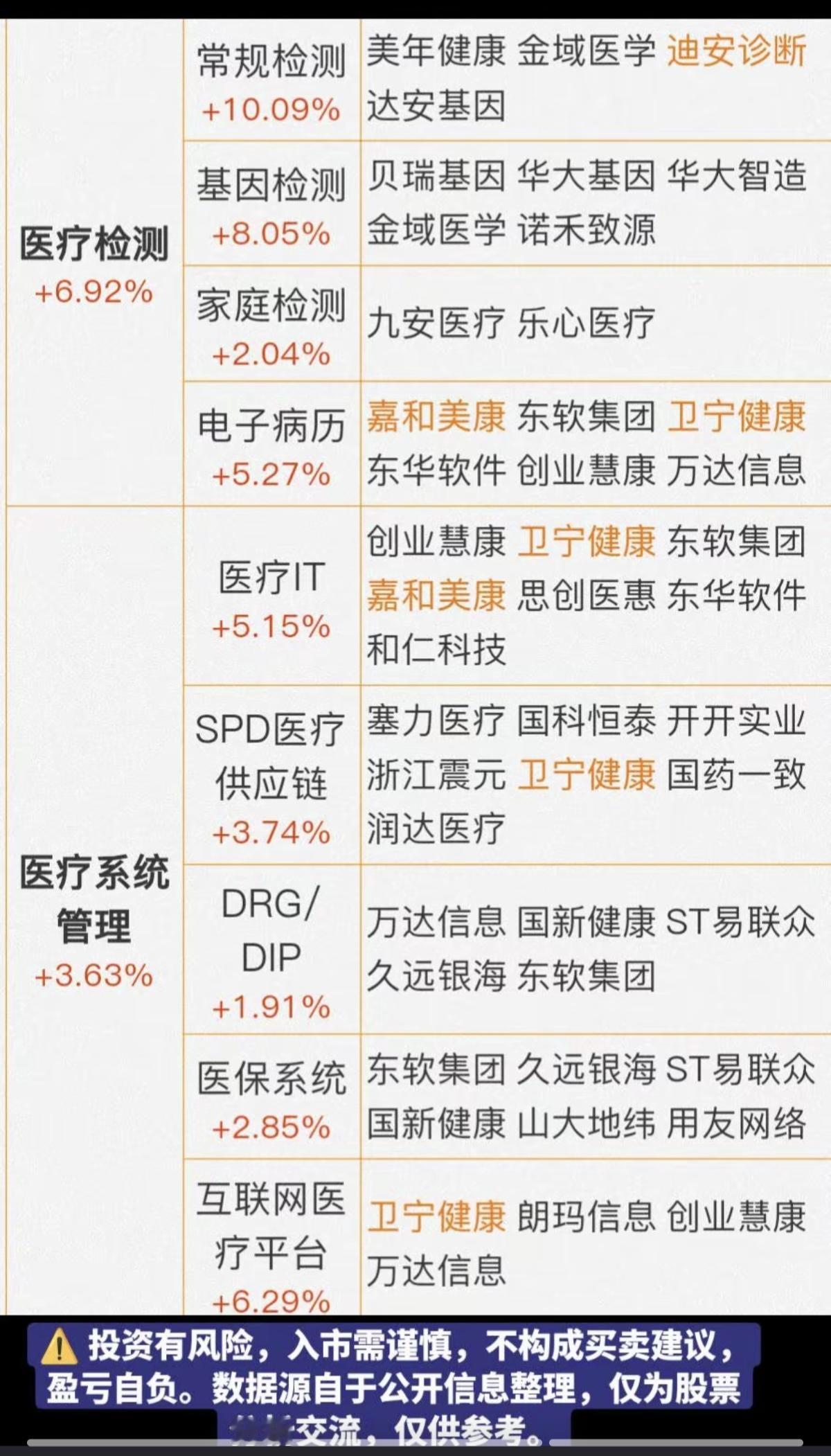 英伟达与礼来共投10亿美元,建设AI药物研发实验室! A股医药、基因检测板块大涨! 1.医疗研究 2.医学成像分析 3.医疗检测 4.医疗系统管理 医药,医疗服务相关核心龙头股: