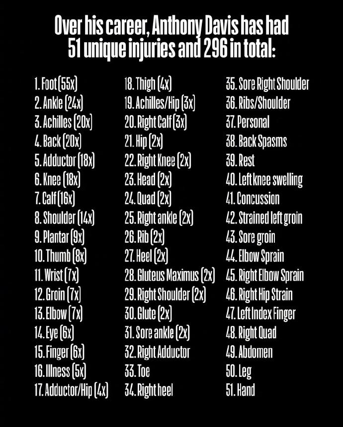浓眉生涯至今:51种伤病,14年,缺席296场 布里奇斯生涯至今:8年,595场全勤 和布里奇斯相比,目前联盟里的任何人都会处于劣势,这是个纯纯的铁血战士,不仅仅是一场不缺,且有段时间是在锡伯杜的执教下,一场不缺,这含金量就非常恐怖了。 而浓眉真的太脆了,生涯至今,他没有遭受那种韧带断裂的大伤,但小伤不断,浑身上下各种疼痛,眼睛就伤了6次,本赛季终于愿意戴眼镜了。 而他的脚,伤了55次!全是小伤,但架不住这么频繁。这也是目前其他球队开始观望浓眉,不着急得到他的原因,他真的太脆了。