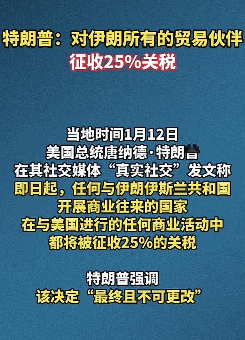 特朗普准备对所有与伊朗有贸易往来的国家征收25%的关税! 特朗普这个操作真的很搞笑,不知道我国算不算与伊朗有贸易往来的国家,因为我们不仅购买来自伊朗的石油,也向伊朗输出大量的产品,这是非常常见的双边贸易。 几乎世界上主流的工业国家都与伊朗有贸易往来,比如说韩国、日本、俄罗斯、欧盟。特朗普这一操作,肯定会导致诸如韩国、日本、欧盟不敢与伊朗做生意,但是这反而给了我们国内的企业一个机会,因为中国是无惧制裁的。