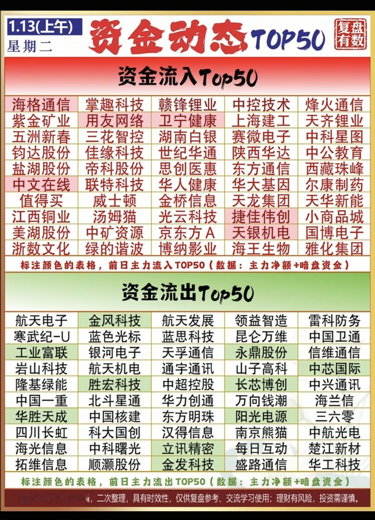 1.13周二 抢筹出逃:大资金流向追踪! 整个市场,医药,医疗服务相关,CRO概念,贵金属,保险等资金抢筹。 军工装备,军工电子,商业航天,成飞概念等资金流出较多