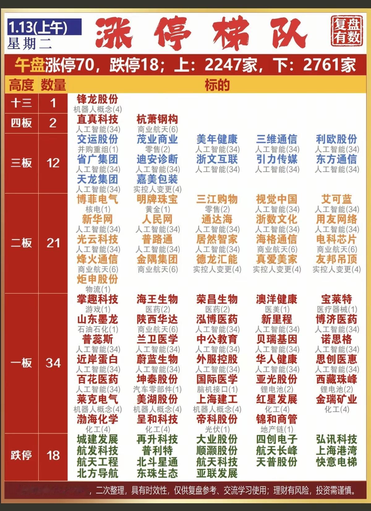 1.13周二 涨停板股票:复盘统计! 商业航天、军工:全线退潮。 涨停板70家,跌18家 涨跌比2247 :2761 焦点:医药板块,AI智能体应用