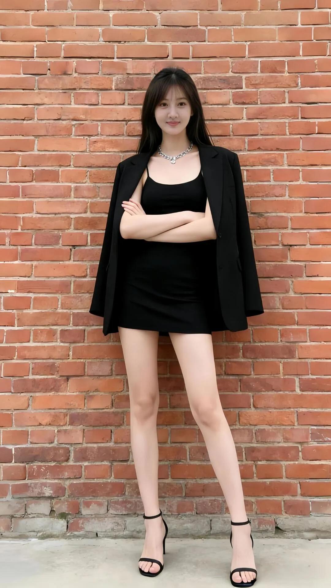 黑色连衣裙搭配高跟鞋,红砖墙前凹造型,秒变时尚都市女郎!街拍 高清美女