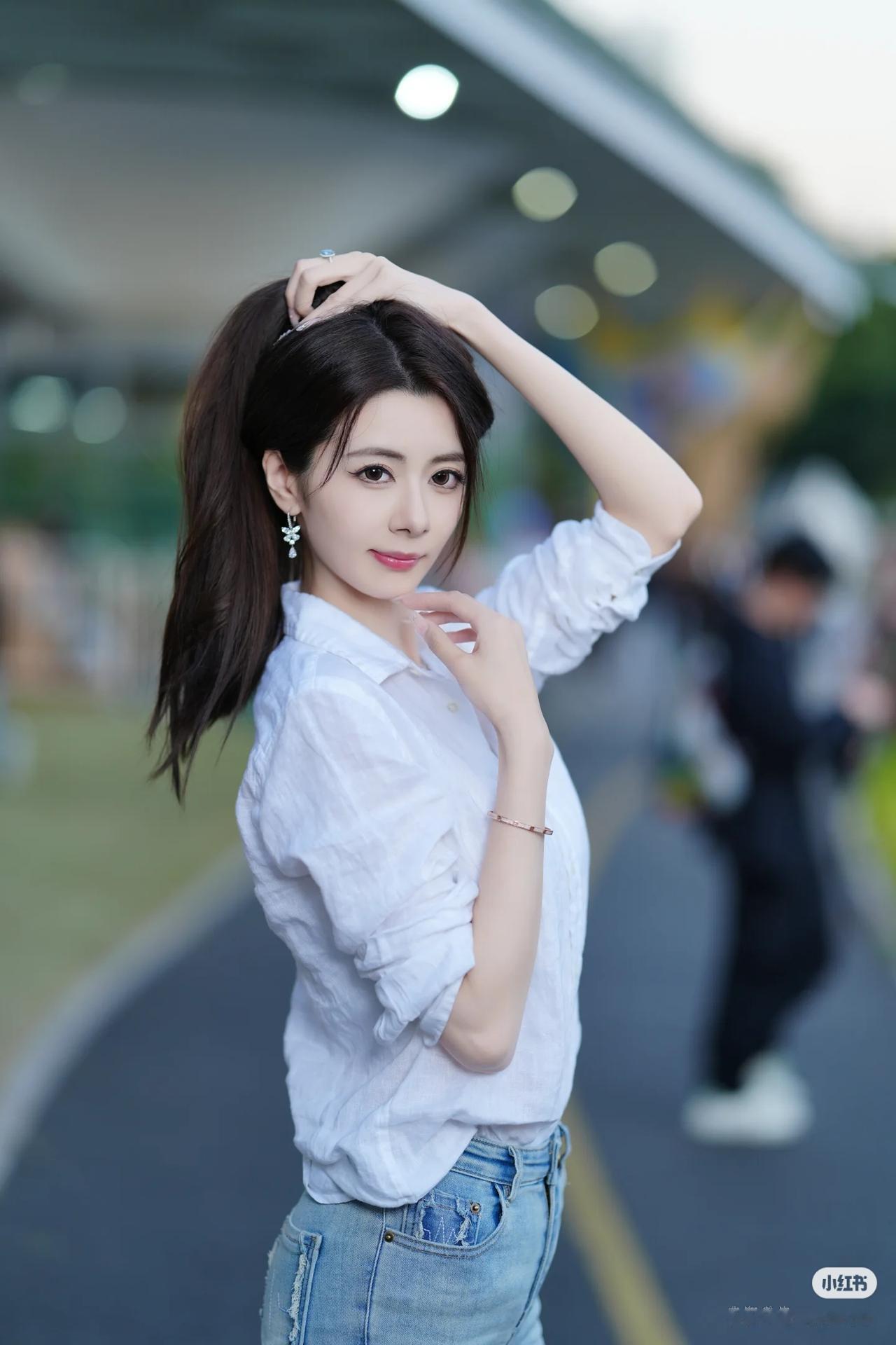 阳光下的甜美少女,微风轻拂发梢,山景作背景,清新自然。牛仔美女