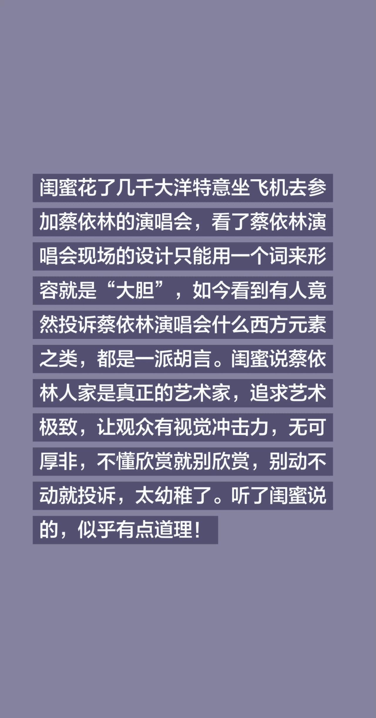 闺蜜花了几千大洋特意坐飞机去参加蔡依林的演唱会,看了蔡依林演唱会现场的设计只能用一个词来形容就是“大胆”,如今看到有人竟然投诉蔡依林演唱会什么西方元素之类,都是一派胡言。闺蜜说蔡依林人家是真正的艺术家,追求艺术极致,让观众有视觉冲击力,无可厚非,不懂欣赏就别欣赏,别动不动就投诉,太幼稚了。听了闺蜜说的,似乎有点道理!蔡依林