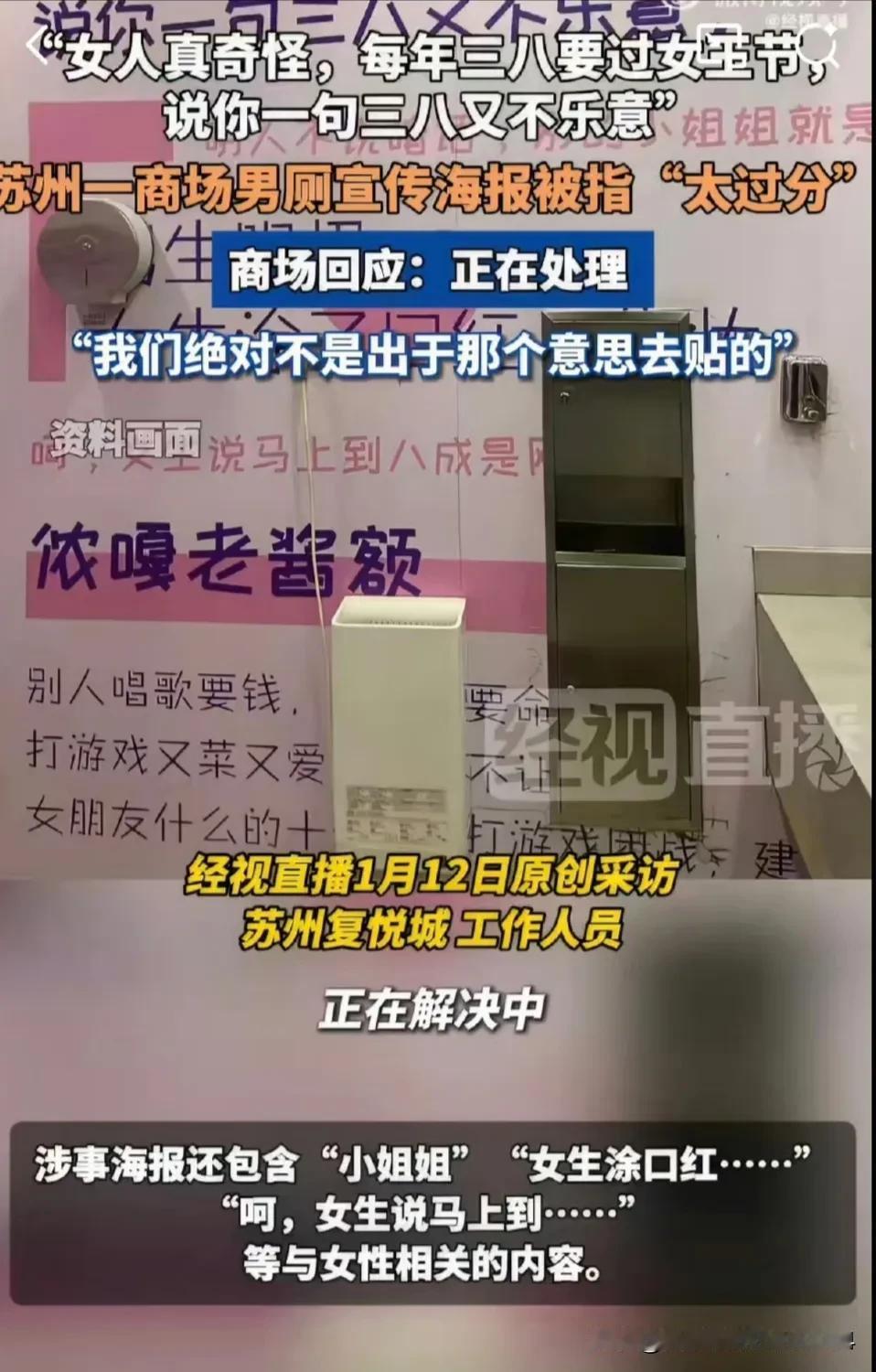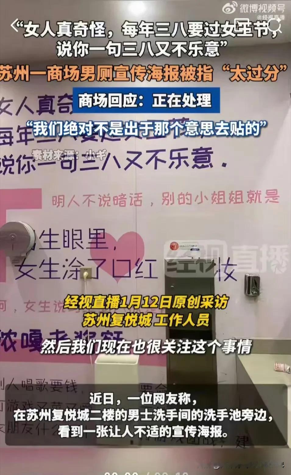 苏州一家商场看似还算上档次,但男厕的海报上,却印满了调侃女性的话“女人真奇怪,每年三八要过女王节,说你一句三八又不乐意”等等。瞅了下,那么大的海报墙,还楞是找不出一句有营养的。 真的是很难想象,商场作为人群密集的公共消费场所,涉嫌辱女的词汇却贴在了男厕,是想凸显什么意义呢? 自古我们华夏都讲究个阴阳互补、琴瑟和鸣、生儿育女、男女各司其职。可最近几年总有人说男女对立严重,可到底都是谁在说、谁在宣传呢? 反正我看到的正经老百姓,都在安生挣钱、过自己的小日子! 商场的回应:我们绝不是出于那个意思去贴的 网友:尊重是底线,别把“冒犯当艺术”,又low又坏心眼!