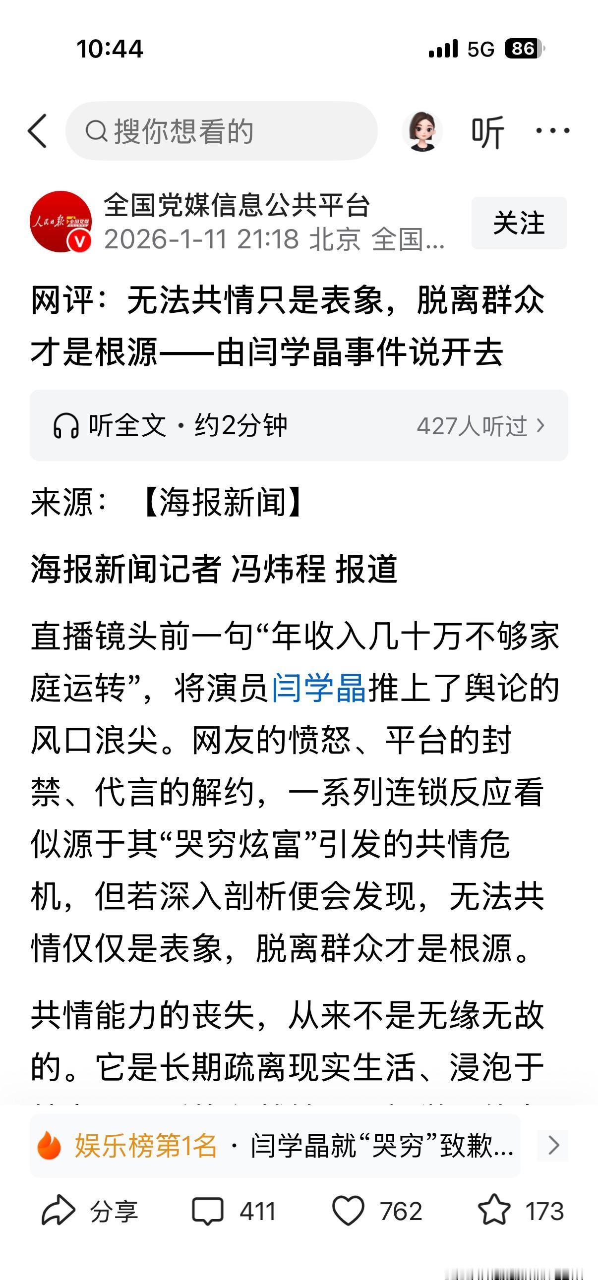 别再吹闫学晶了,她早已听不见人间的烟火。 镜头前,她谈艺术,谈感悟,字字珠玑。 镜头后,她离菜市场的吵闹、离邻里的寒暄,有多远? 一个演员,如果闻不到泥土的腥味,摸不到生活的粗粝,她的表演,就只剩下空洞的躯壳。 看看那些真正扎根下去的艺术家。 他们走进社区,走进田间地头。 不是蜻蜓点水,而是同吃同住同劳动。 汗水浸透衣背,手掌磨出老茧。 这才是创作的养分。 一边是高高在上的“自我感动”,一边是俯下身子的“同频共振”。 当一个人忘了来时的路,忘了托举她的那片土地,她的艺术生命,也就走到了尽头。 群众基础,从来不是一句空话。 那是根,是命。 当掌声不再为你响起,你还会记得当初为何出发吗?