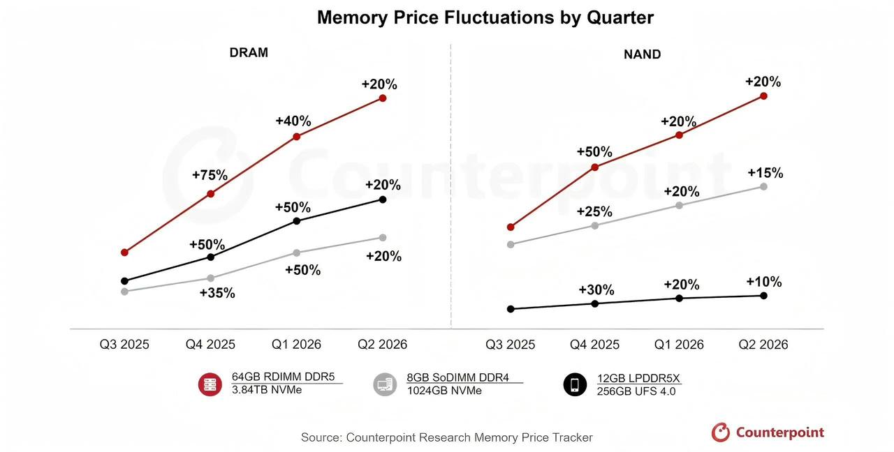【2026年存储价格Q1预计再涨40%-50%】Counterpoint报告指出,全球存储市场已进入“超级牛市”,行情超越2018年高点。2026年Q1存储价格预计再涨40%-50%,Q2涨幅仍保持约20%。以64GB RDIMM内存条为例,2025年Q3至Q4价格从255美元跃升至450%,涨幅超76%,预计2026年3月将突破700美元。