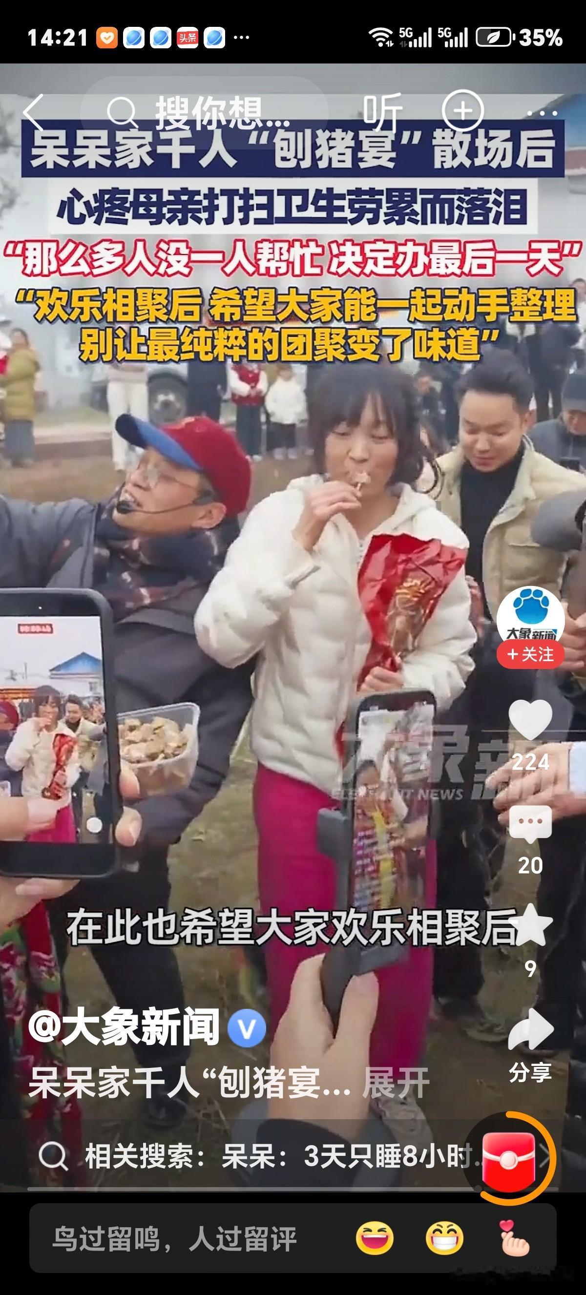 呆呆家千人"刨猪宴”背后问题?非没人打扫卫生,而是当今社会对人间烟火气息之追忆。至于清理"战场”左邻右舍,亲友及女孩。 杀年猪是民俗,上个世纪在东北农村寻常事。只需在门口喊一嗓子,屯子里便会有人来帮忙,还可吃顿猪肉炖酸菜外加血肠。 因那个年代人们,脑子里还残留集体经济余热,一户有事,十户出人帮,并且青壮年大多在家。关键亲情邻情热情还有。 随着时代进步,农民大量涌入城市,住进了水泥森林"笼子里”,又把门锁上手捧电脑或手机,饿了叫个外卖,渴了买桶装水,有屎有尿”笼子"里解决!这样彻底于外面隔决,过上了室内桃源生活。由此人间烟火味道,至止退出人类生活舞台。 重庆女博士发贴事件,应该会引起人们共鸣,向当下社会提出一个灵魂拷问,丢失的人间烟火气息,有必要再找回来不?网友们回答!