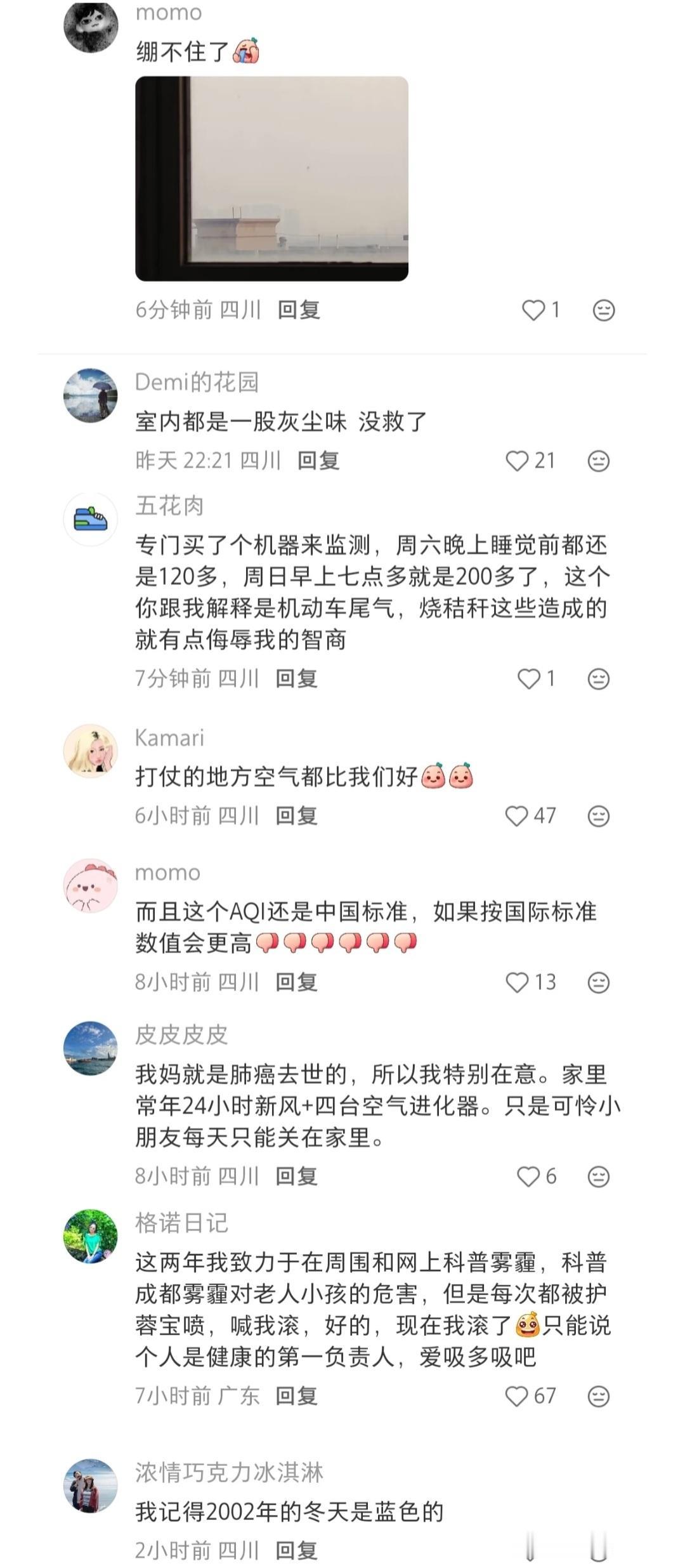 成都,斩杀线来了? 近几个月我在网络上常见网友吐槽,成都雾霾厉害。近日有消息称,成都全球第一,重庆全球第四。见图1~2。 其实不止是成都、重庆。 据媒体报道,近几个月,上海江苏浙江京津冀山东山西河南湖北湖南等全国多个大中城市迎来持续的严重程度不等的雾霾天气。见图3。 别小看了PM2.5!专家指出:其年均浓度每增加10微克/立方米,非意外全因死亡率包括非传染性疾病和下呼吸道疾病等,将上升8%。见图4。 各位有啥看法?@真业心学创始人东方赢 欢迎评论。