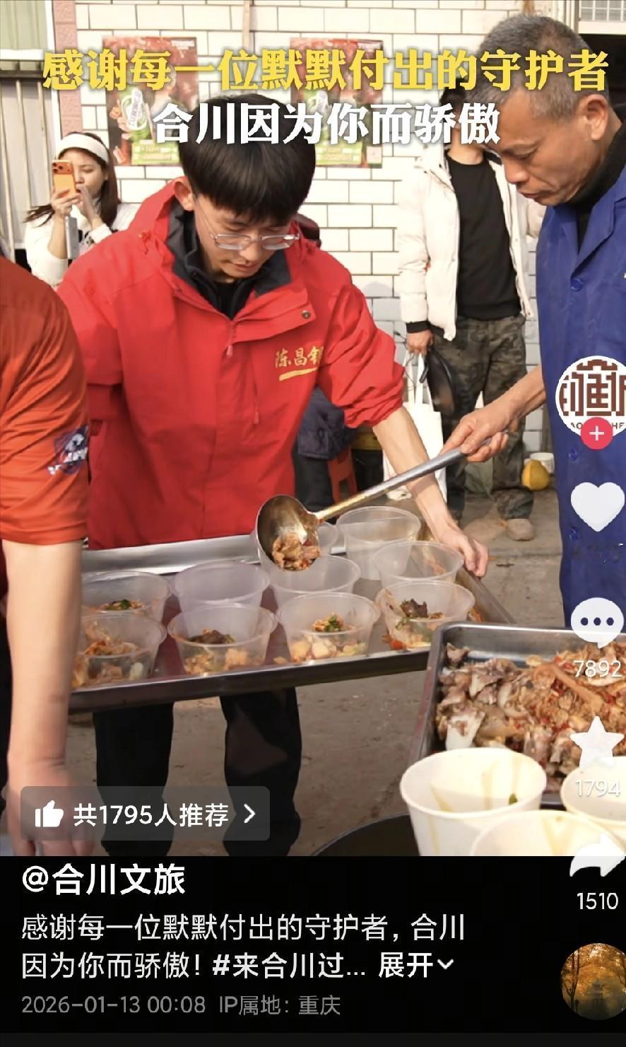 合川文旅功不可没,真给力! 重庆合川文旅局长喊话: “作为合川文旅,必须实名欢迎各位追味而来的宝子:欢迎来合川‘蹭饭’,我们的热情管够!” 最近,合川庆福村“呆呆家刨猪汤”一下子突然爆火,谁能想到一个23岁姑娘随手发的求助视频,能引来这么大的阵仗。 呆呆就是想找几个人帮年迈的父亲按猪,承诺管一顿刨猪汤,还俏皮说想让家门口车比结婚还多,结果这条15秒的视频48小时就收获18万点赞、14万转发,5个500人的粉丝群一夜之间全满了 全国各地的网友真就带着热情奔赴而来,车牌从渝A、川A到更远的省份都有,短短几天里到现场的网友就超过4000人次,直播间最高在线人数峰值超16万,累计点赞更是达到3304.5万次,相关话题播放量直接冲到8000万。 一开始呆呆家只准备了2头猪,计划摆15桌饭菜,可实际来的人远远超出预期,中午就超了两三桌,到了下午院子里、田埂上都摆满了桌子,足足开了30多桌,后来更是杀了5头猪才勉强够吃,多出来的3头要么是企业赞助要么是网红自带 这突如其来的热闹让这个普通农户家彻底招架不住,呆呆前后只睡了不到8个小时,她爸妈更是急得到处借桌椅板凳,要是没人帮忙兜底,这场热闹恐怕要变成乱糟糟的尴尬场面。 就在这关键时候,合川文旅真是太给力了,他们从网友的留言里察觉到热度后,没有半点犹豫,凌晨2点就组织了第一个小分队赶到现场,这份反应速度真让人佩服。 知道食材不够,文旅连夜调配了2头本地黑猪送过去,还协调了周边的农产品资源,最后现场消耗的11头生猪里,文旅的补充起到了关键作用,彻底避免了“客人来了没的吃”的窘境。 更贴心的是,他们还带来了500份合川桃片、1000张钓鱼城景区门票,给远道而来的网友们送上实打实的福利,让大家不仅能吃好,还能玩好。 现场的秩序维护更是看出合川文旅的用心,当时进村的车辆排了足足3公里,加起来有1650辆之多,要是没人疏导肯定得堵得水泄不通。 文旅联合公安、街道工作人员一起上阵,指挥停车、维持秩序,还有80多名热心志愿者加入,大家一起分工,让整个现场忙而不乱。 考虑到呆呆家场地太小,容不下这么多人,文旅又赶紧推出了错峰分流的办法,精选了5个特色点位接续举办活动,还一口气推广了27个刨猪汤体验点,单日就能接待8800名游客,消化820桌饭菜,把集中的人流分散开,既保证了大家的体验,又减轻了农户的压力。 最难得的是,合川文旅全程守住了这份乡土本真,他们和呆呆达成共识,现场不搞任何商业赞助,所有体验项目都免费开放,派发门票和特产也不附加任何消费条件,就是怕过度商业化毁了这份纯粹的烟火气和人情味。 他们还一天连发9条视频,实时发布交通指引、限流提示,还整理了合川游购娱攻略和优惠政策,让网友们不管是想去吃刨猪汤,还是想逛钓鱼城、买特产,都一目了然。 这场由网友自发掀起的狂欢,之所以能既热闹又稳妥,变成一场现象级的民俗盛宴,合川文旅真的功不可没。 央视网、新华网这些大媒体都纷纷报道,全国各地的网友都在为合川文旅点赞,有山东网友说他们反应快、做事不拖沓,有上海工作的四川网友专门想来合川吃刨猪汤、买年货。 更实实在在的是,这波热度直接带动了合川的文旅经济,城区酒店订单暴涨300%,部分酒店入住率达到100%,合川桃片、米粉这些22款本土产品销量翻倍,现场设立的15个农产品展位人气爆棚,还有超500名游客拿到钓鱼城门票后表示要留下来游览,真正把流量变成了实实在在的发展动力。 呆呆的账号从原来不足500粉丝,短短几天就涨到170多万,这场意外的爆火没有变成一场混乱的闹剧,反而成了展示合川魅力的窗口,这背后全靠合川文旅的及时补位和周全安排。 他们没有生硬干预,而是顺着网友的热情顺势而为,用真诚的服务、扎实的行动,既保住了这场盛宴的烟火气,又成功宣传了合川的文化和特产,让大家记住了合川的热情,也记住了这里的美景美食。 这样的文旅部门,真是把“为游客着想”落到了实处,说他们功不可没,真是一点都不夸张,这样的文旅操作,值得所有人点赞!