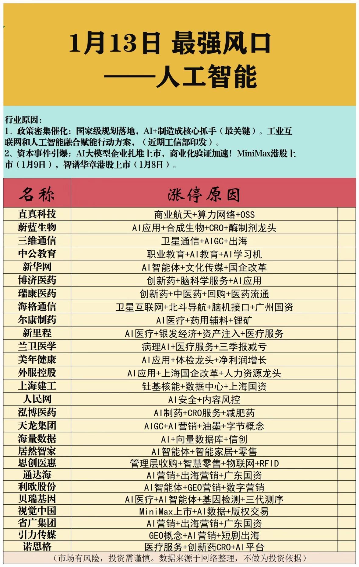 1月13日最强风口:人工智能行业分析 AI风口爆发:政策催化+资本助推,医疗、营销、家居多领域加速商业化 AI概念股爆发:政策催化+资本助推,聚焦智能医疗、营销、家居赛道,多企业上市加速商业化