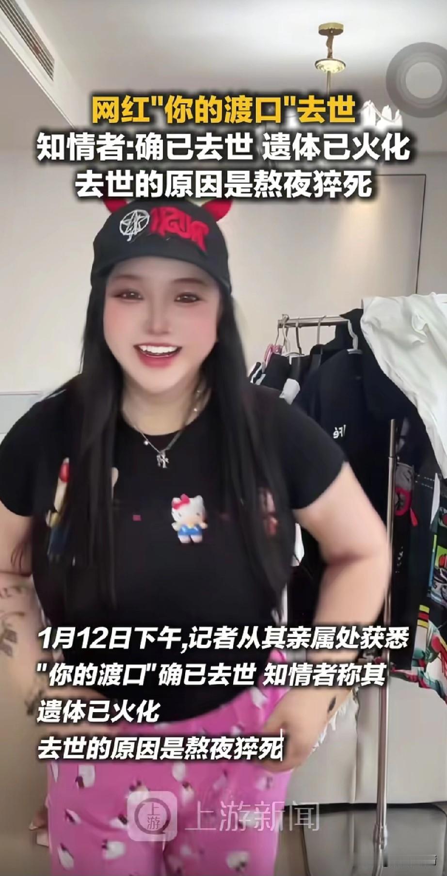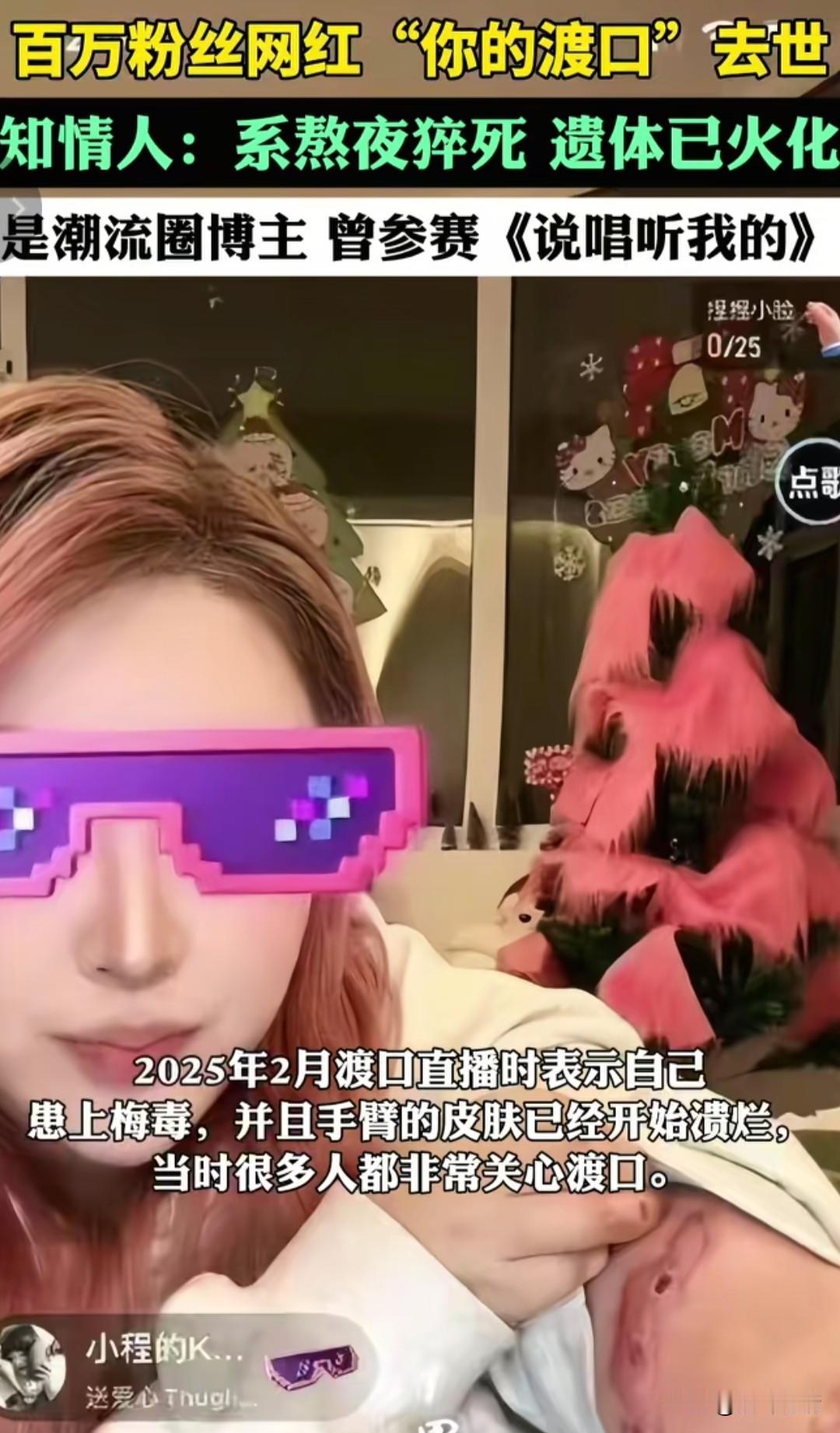 潮流穿搭博主“你的渡口”这些年到底经历了什么?身材严重走样,居然还染上了梅毒! 她凭借自己独特的穿搭和球鞋分享在短视频圈混的风生水起,曾一度实现财富自由! 但为何短短几年变化这么大?从前凸后翘,变成了肥胖大姐!原来她实现财富自由,身边没有真正的朋友! 都是一群唯利是图的网络名媛,她们天天带着口子姐混迹各种娱乐场所,出入高档会所,等到口子姐的钱花的差不多了! 这些所谓的朋友都离她而去,再加上她投资失败,一度让她欠了很多外债,为了还债,没有办法再次出现在了直播间, 从她来时的路走起,给大家推销起了潮流穿搭,这时候的大家才看到口子姐已经发生了翻天覆地的变化,不仅再也不像以前一样美丽性感,如今的她体态肥大,还有双下巴! 虽然依旧有很多粉丝支持,看着她在直播间卖力的推销,偶尔也有人会下单支持, 但是巨额的债务压的她喘不过气来,再加上父亲的离世,让她一度患上了精神抑郁,直到2026年1月1号的凌晨,她的身体再也撑不住了,突然猝死! 大家对于她的死因议论纷纷,有的网友表示熬夜真的太伤身体!也有网友表示她混乱的私生活才是最终原因! 不管到底是什么原因,人去世了就应该获得尊重,毕竟斯人已逝,她用自己的一世告诫了她的姐妹们,生活要自律,自重! 大家对于网红口子姐去世登上热搜这事怎么看? 你知道的大网红都有谁 你的渡口