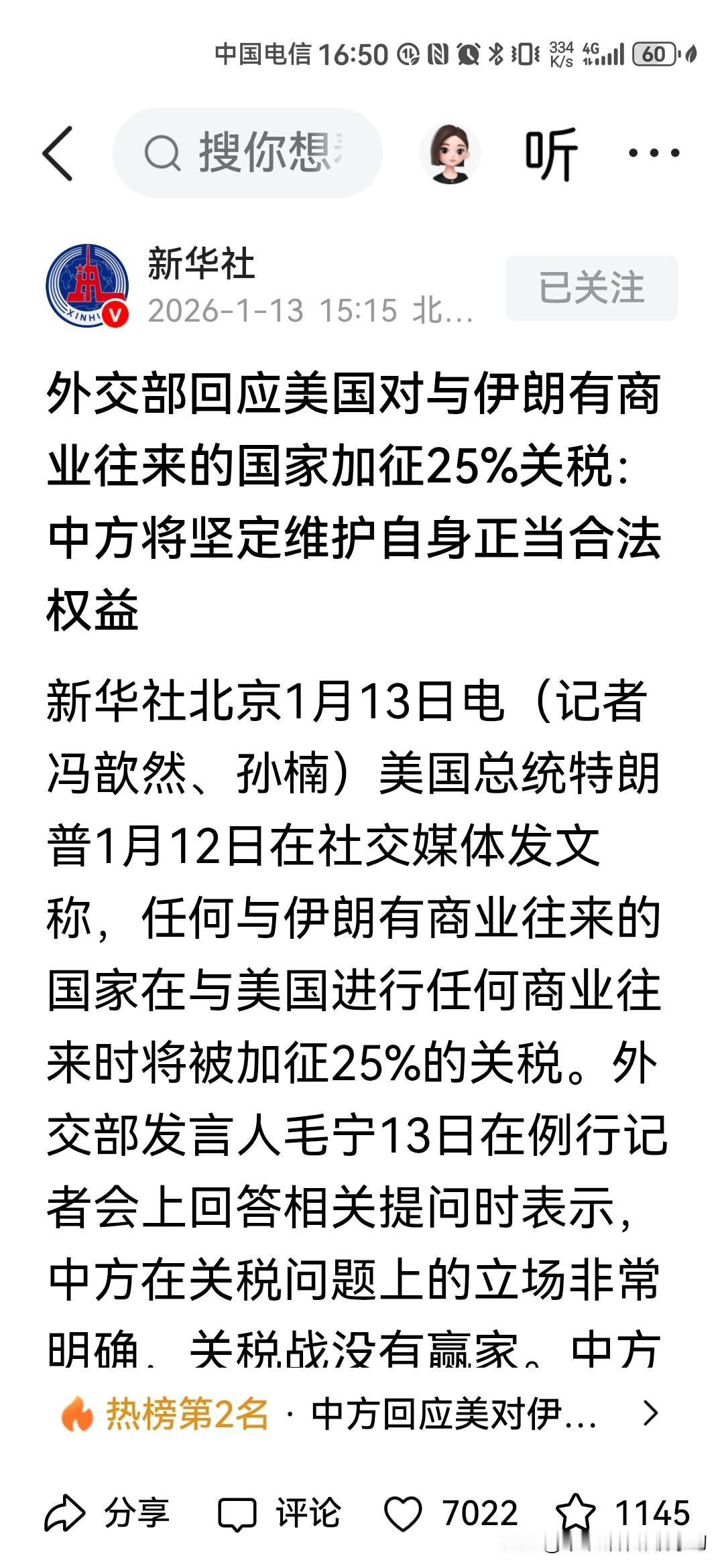 受不了了,美国又挥关税大棒了!特朗普发话,凡是跟伊朗做生意的国家,和美国做生意都得加收25%的关税。这招够狠,直接逼全球站队。 咱们外交部反应很快,发言人毛宁当天就回应了:关税战没有赢家,中方会坚决维护自己的正当权益。这话说得硬气,意思也很明白,我们不惹事,但也不怕事。 这事儿说白了,就是美国想用经济手段孤立伊朗,顺便敲打它的主要贸易伙伴,比如咱们中国。但现在的世界,早就不是谁说了算的年代了。你搞单边制裁、长臂管辖,破坏的是全球产业链,损害的是所有国家的利益。咱们跟伊朗的正常贸易,合理合法,凭什么要看你脸色? 我觉得,美国这老一套的霸凌手法,越来越不灵了。合作才能共赢,对抗只会双输。它这么搞,只会让更多国家看清现实,加快“去美元化”,寻找新的合作路径。压力之下,伊朗可能会更坚定地“向东看”,深化与中俄的合作,这反而可能加速形成新的经济格局。 结尾想问大家:面对这种强权施压,你是觉得应该硬刚到底,还是迂回周旋?评论区聊聊你的看法。 消息来源:综合自新华社、
