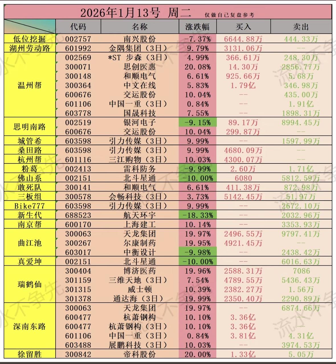 2026年1月13日龙虎榜股票涨跌榜,见证市场风云变幻! "股市复盘:多股涨跌显著,巨力索具涨10%,航天电子跌10%,资金流动活跃,关注热门板块动向。" 股市复盘:多股涨停,巨力索具、海格通信领涨,部分个股跌停,资金活跃,关注强势股动向。