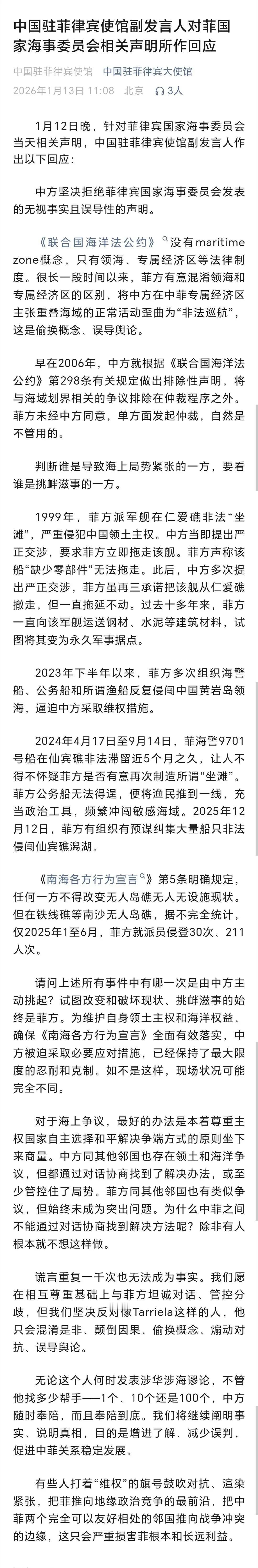 中国使馆愤怒发声:已保持最大限度忍耐! 当地时间1月12日,菲律宾国家海事委员会发表声明,再次就南海问题对华发难,指责中方在相关海域的“非法巡航”。中国驻菲律宾使馆则在13日发声,予以严正驳斥,字里行间都是掩饰不住的愤怒。 这话里的愤怒,谁都能读得出来!“已保持最大限度忍耐”,这句话分量太重了,是中方在南海问题上少有的强硬表态,背后藏着多少隐忍和克制,只有我们自己清楚。菲律宾国家海事委员会这份声明,简直是把颠倒黑白玩到了极致,拿着早已被国际社会看穿的谎言当武器,在南海问题上继续挑衅,真当中国的克制是软弱可欺吗? 菲方在声明里反复提两个东西,一个是《联合国海洋法公约》,一个是2016年那个所谓的南海仲裁裁决。可他们偏偏忘了,《联合国海洋法公约》里根本就没有什么“maritime zone”的概念,只有领海、专属经济区这些明确的法律制度 。他们故意混淆领海和专属经济区的区别,把中方在中菲专属经济区主张重叠海域的正常巡航,说成是“非法行动”,这不是偷换概念是什么?不是误导舆论是什么? 更可笑的是那个2016年的仲裁裁决。菲律宾在未经中方同意的情况下,单方面提起仲裁,这种程序本身就违法,结果自然是无效的,不具任何法律约束力。早在2006年,中方就根据《联合国海洋法公约》第298条,做出了排除性声明,明确不接受任何与海域划界相关的国际仲裁 。菲方拿着一张废纸当令箭,在国际上招摇撞骗,只会让人看笑话。 谁在挑衅,谁在忍耐,事实一查便知。就说铁线礁这些南沙无人岛礁,光2025年上半年,菲方就派员侵登30次,累计211人次。这些数据不是编造的,是实打实的记录。菲方一边派船擅闯中国领海,一边倒打一耙说中方“非法巡航”,这种操作真是刷新了无耻的下限。中方每次都是被迫采取必要应对措施,目的只是维护自身领土主权和海洋权益,落实《南海各方行为宣言》。若非如此,现场状况可能完全不同,菲方恐怕早就尝到挑衅的苦果了。 菲方最近的动作更是过分。一边邀请美日新澳加五国在南海搞联合军演,试图拉帮结派围堵中国;一边把中国海军救助菲渔民的人道主义行动,污蔑成“政治宣传”。1月6号,菲律宾武装部队还公开说要长期维持南海海空行动能力,把这些海上合作当成作战设计的一部分。这哪是想解决问题,分明是想把南海搅得更浑,把地区局势推向危险边缘。 中国使馆的回应里还有句狠话:“不管他找多少帮手——1个、10个还是100个,中方随时奉陪,而且奉陪到底”。这话不是吓唬人,是中国捍卫领土主权的决心宣言。南海诸岛自古以来就是中国领土,从秦汉时期的“涨海”记载,到明清时期的水师巡防,历史铁证如山,容不得半点篡改。中国在自己的海域巡航,天经地义,合法合理,轮不到别人说三道四。 菲方这么折腾,背后的算盘谁都清楚。无非是想借外部势力的手,在南海谋取非法利益,巩固自己在国内的政治地位。可他们忘了,南海的和平稳定,才是菲律宾最大的利益所在。中国是菲律宾的重要贸易伙伴,2025年双边贸易额突破800亿美元,中国还是菲律宾香蕉、芒果等农产品的最大出口市场。一旦南海局势失控,最先受损的就是菲律宾的经济和民生,菲方政客真该好好掂量掂量。 更让人不齿的是,菲方一边享受着中国带来的经济红利,一边跟着外部势力在南海挑衅。这种两面派做法,最终只会搬起石头砸自己的脚。中国的忍耐不是无限的,“最大限度”这四个字,已经划下了红线。菲方如果继续执迷不悟,执意挑衅,必将遭到坚决反制,为自己的行为付出沉重代价。 南海的和平稳定,需要的是对话协商,不是武力威胁;需要的是尊重事实,不是歪曲抹黑。中国始终愿意和菲律宾通过平等对话,妥善处理南海争议,共同维护地区和平稳定。但前提是,菲方必须停止挑衅,尊重中国的领土主权和海洋权益,回到谈判桌前,用理性和务实的态度解决问题。 “已保持最大限度忍耐”,这句话既是警告,也是最后通牒。菲方该醒醒了,别再被外部势力当枪使,别再做损害两国关系和地区稳定的蠢事。否则,中方的反制,绝不会手软。 各位读者你们怎么看?欢迎在评论区讨论。