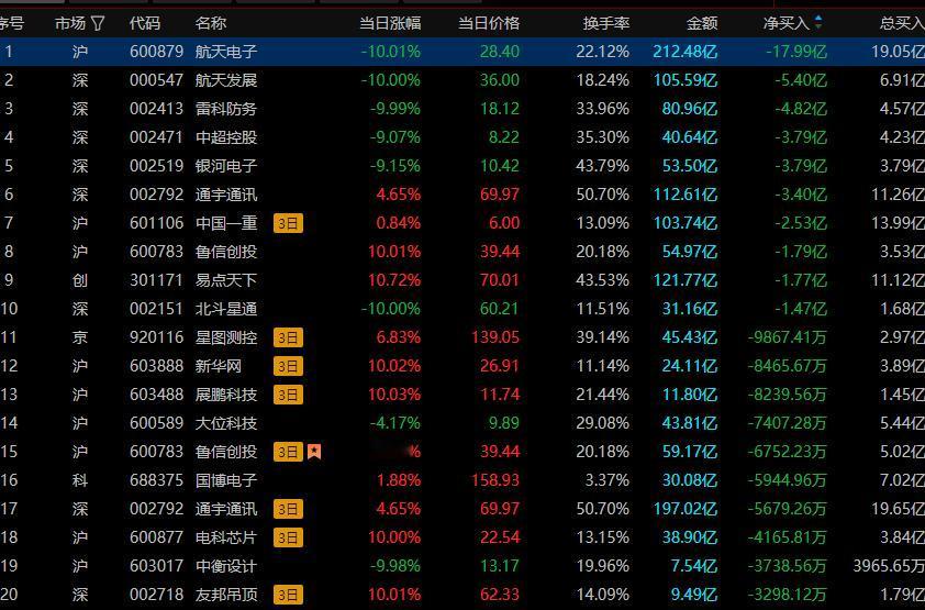 资金在商业航天再次出现了大的分歧,特别是高标股的分歧很大,高位个股跌幅超7%的达159家,整个板块436家公司381家下跌,板块指数下跌5.01%,这是连续12根阳线后的首个大阴线。 关键是游资在高位股市胜利大逃亡!龙虎榜单上净流出前10名中,9家都是商业航天概念,而且接近2倍的个股航天电子跌停,龙虎榜净流出17.99亿,而全部大资金净流出达43.56亿。盘中有资金还是想扭转颓势的,但最终还是无果而终的封死跌停了,这也是这些个股盘中的统一动作。这无疑给商业航天未来的运行打下了整体触顶的预期。高位股的风险加大了。 再强的板块中的强势个股,高位还是要看两家形态的转变。商业航天板块还留有一线生机,连板梯度还有4板,但大多是相对低位的个股,且叠加有其他热点属性。这也许是市场资金在临近年报即将密集预报期的提前反应,毕竟商业航天的很多公司的业绩还没有得到兑现。情绪的炒作可能要告一段落了。