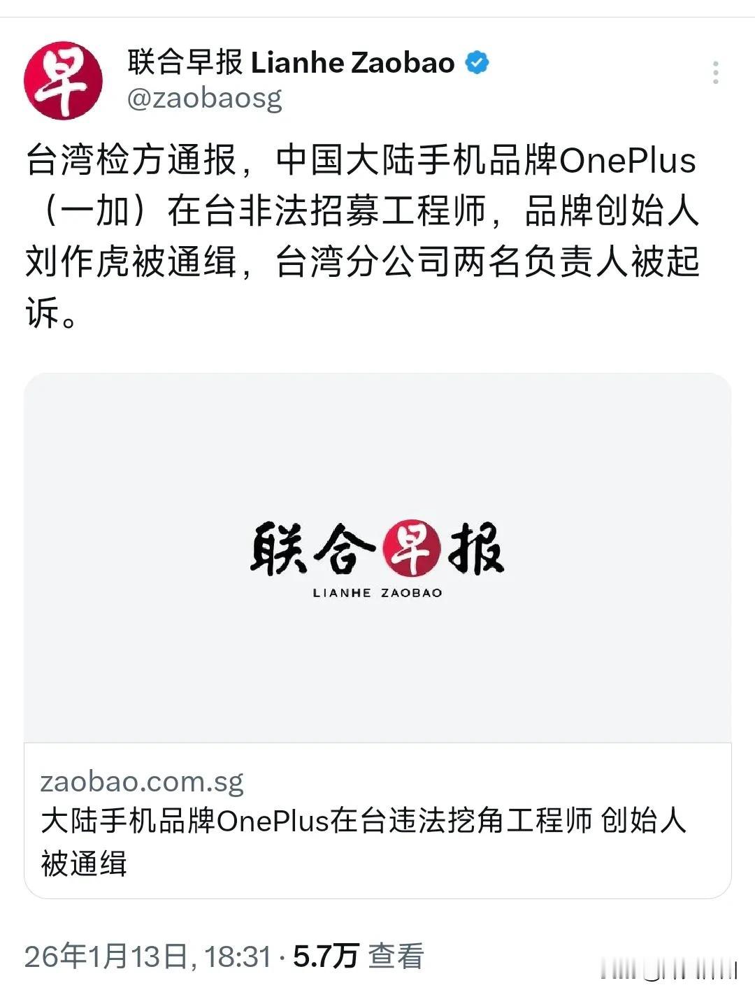新加坡联合早报今晚(1月13日晚)报道:“台湾检方通报,中国大陆手机品牌OnePlus(一加)在台非法招募工程师,品牌创始人刘作虎被通缉,台湾分公司两名负责人被起诉。” 评几句: 大陆手机品牌一加创始人刘作虎,因涉嫌通过“港资壳公司”伪装,在中国台湾地区非法招募70余名工程师,被当地检察相关机构通缉,两名台籍负责人遭起诉,6年间超7293万美元资金违规流入中国台湾地区。这绝非单纯企业违规,更是两岸人才流动壁垒下的畸形案例。 本质上,这是“换壳避规”的典型操作——先设香港公司、再更名一加在台相关机构,看似合规实则完全受深圳总部掌控,研发成果专供一加和OPPO使用,直接触碰台湾地区相关规定红线。但更值得深思的是,大陆早已敞开怀抱:厦门给台青发创业补贴、宁德时代等大厂每年给台胞提供超百个实打实的就业机会,台湾职业资格直接采认、职称评审同等认可,惠台政策覆盖就业创业全周期。可台湾地区却对陆资入台设下重重限制,据公开行业报告显示,49%服务业禁止陆企投资,连驻台人员数量都严格管控,堪称“只准钱来、不准人来”。 企业逐利不能突破合规底线,但两岸同胞同根同源,人才流动本是互利共赢的好事。大陆的惠台诚意摆得明明白白,台湾地区却用壁垒逼企业走“灰色地带”。与其搞人为设限,不如打通双向合规的“阳光通道”,让两岸人才自由流动、产业深度融合,这才是真正惠及同胞的务实之举!