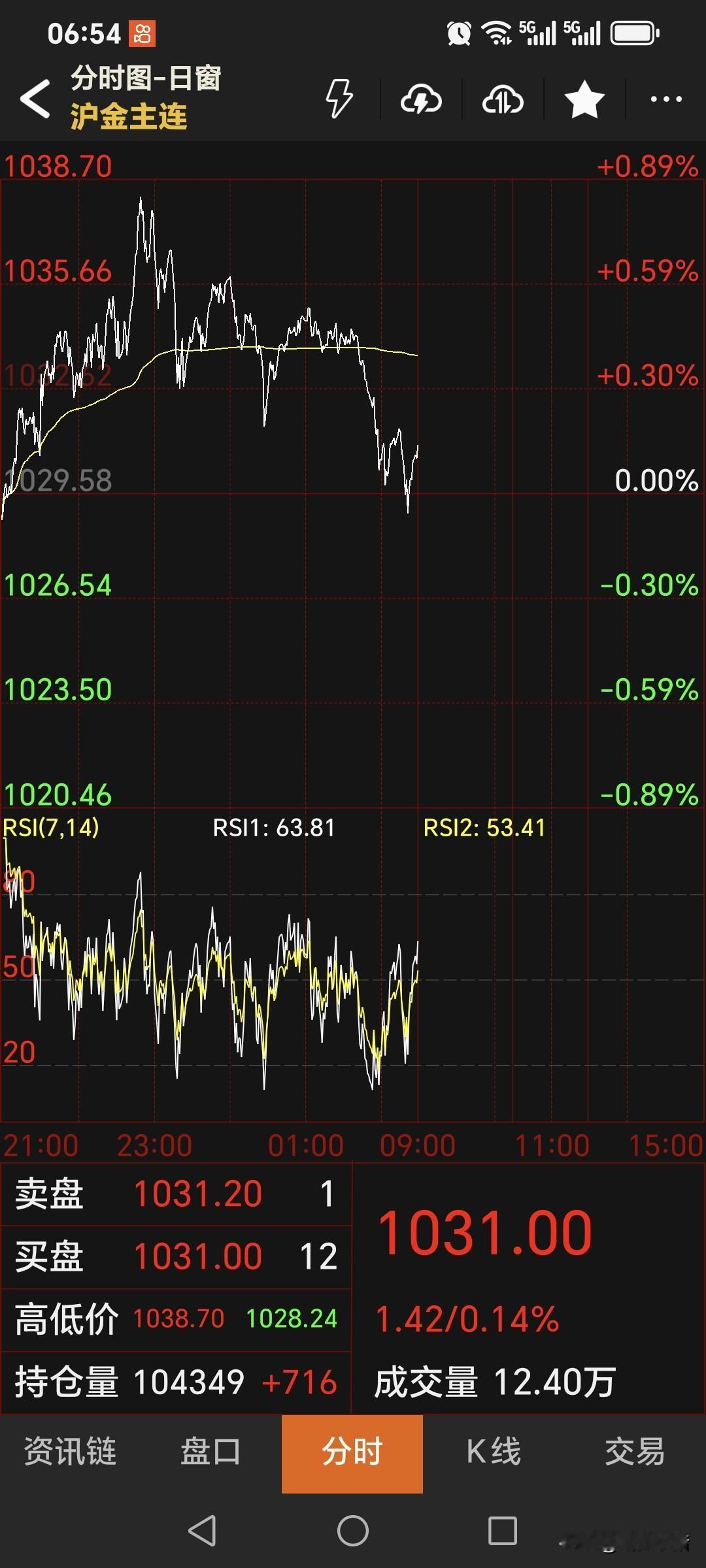 昨晚,国内黄金期货 冲高减弱,小幅走强。 主力合约停收于1031元, 盘中再创历史新高。 对于黄金期货后市, 期货小褚建议大家 关注上方1050压力情况!
