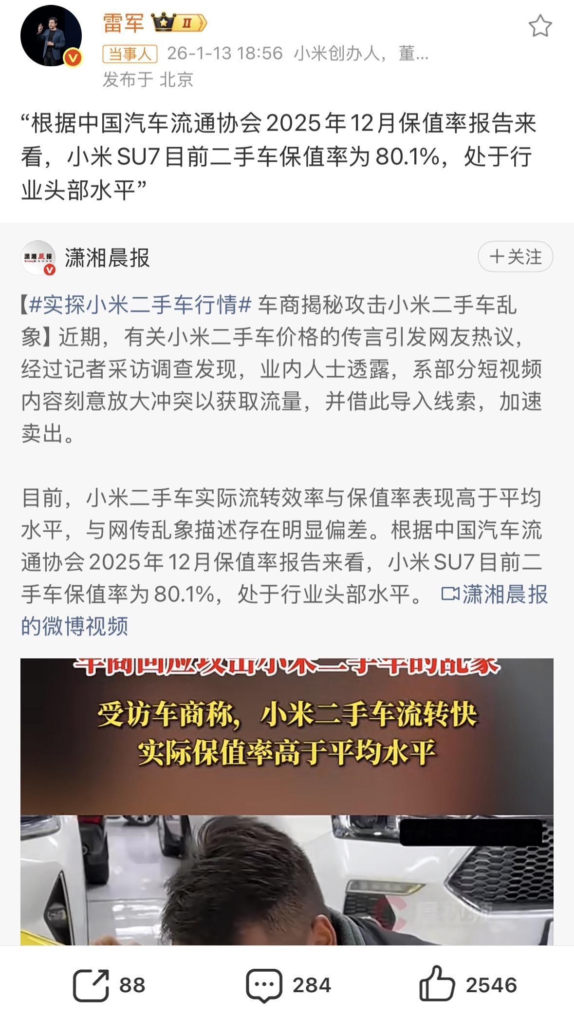 雷军回应小米二手车行情从相关数据来看,小米SU7保值率是行业头部水平,一些车商应该是囤了SU7,现在新款SU7快来了,想要借助流量加速卖掉老款车吧?