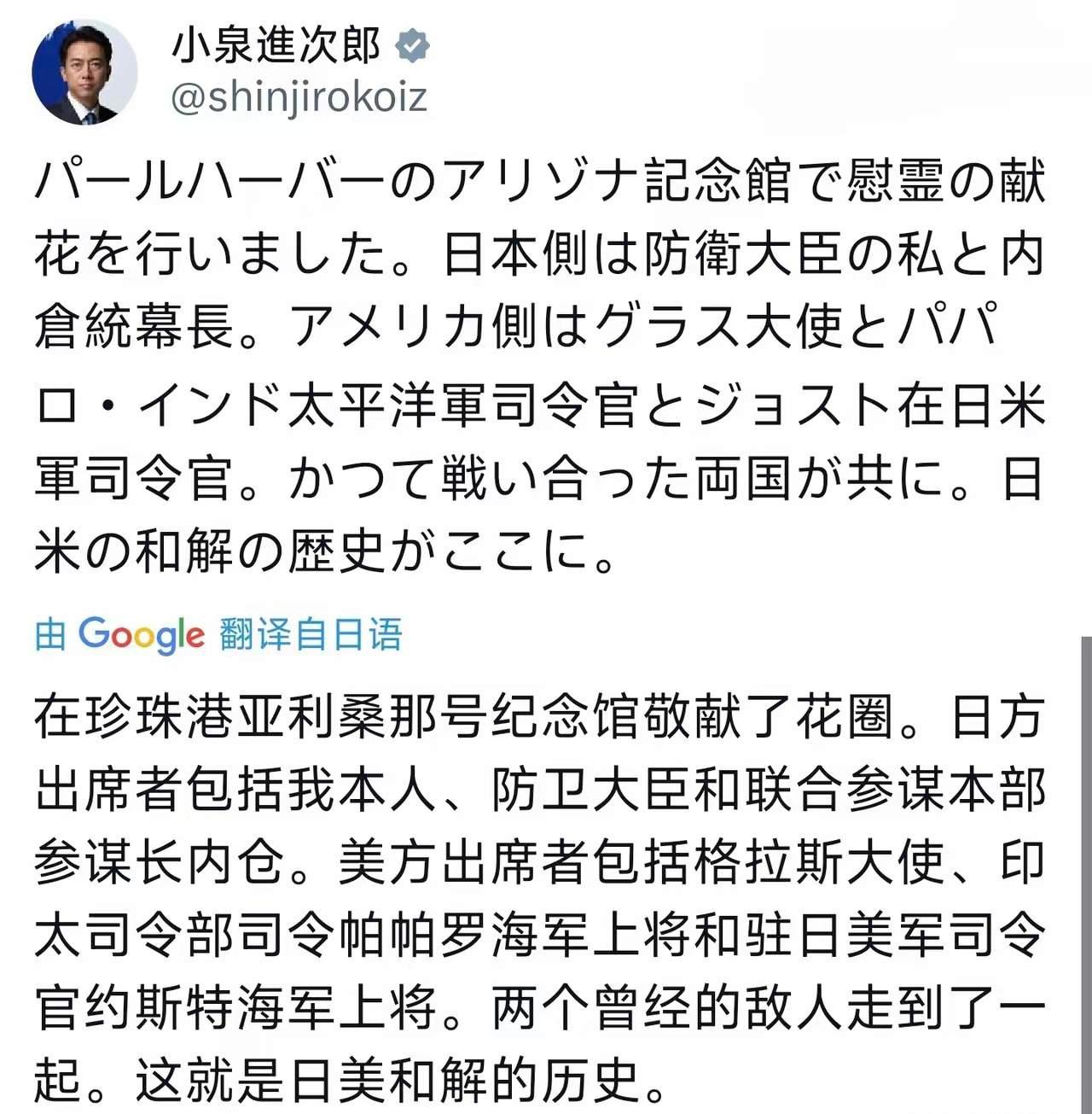 1月13日,正在美国访问的日本防卫大臣小泉进次郎发文称:在珍珠港亚利桑那号纪念馆举行了献花活动,出席活动的有我和内仓统幕长。美国方面有格拉斯大使、印度太平洋司令部司令帕帕罗和驻日美军司令乔斯特。两个曾经的敌人走到了一起。 小泉进次郎不觉得尴尬吗?到曾经被日本偷袭的珍珠港事件中击沉的战舰进行悼念活动,一方面是放下姿态,极尽讨好美国;一方面是企图通过自己的行为争取得到美国支持。 小泉进次郎的这种作派,并未得到美方的格外青睐和照顾,美军印太司令帕帕罗虽然出席了活动,但对于台海问题以及我方的反制措施等等,选择了刻意回避,小泉进次郎没有获得想要的支持。 小泉所谓的“两个曾经的敌人走到了一起”,只不过是其为了进一步强化日美同盟关系的重要性,为自己脸上贴金罢了。 美国又怎么能和日本真正走到一起,不过是根据美国国家利益需要,把日本作为印太地区一颗棋子而已,需要时候用之,必要时候也可以弃之。 注:亚利桑那号纪念馆位于美国夏威夷州珍珠港内,用于纪念在1941年12月7日,日本偷袭珍珠港事件中沉没的战舰“亚利桑那号”及1177名阵亡官兵。