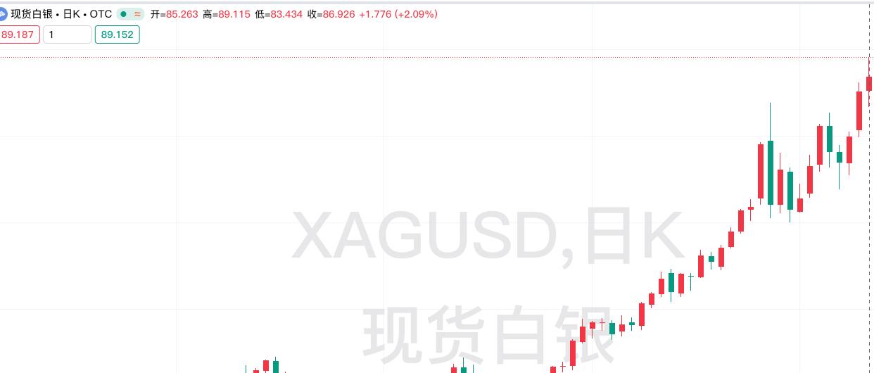 昨日白银继续走强上涨, 现货白银盘中更是突破89美元, 最高升至89.115美元, 不过冲高减弱, 最终收盘于86.926美元, 较上一日上涨1.776美金, 涨幅为2.09%。 这也是近期连续第三天上涨。 白银昨日没能突破90美元关口, 今日上午还在继续上攻。 对于疯狂的白银, 期货小褚建议大家注意风险!