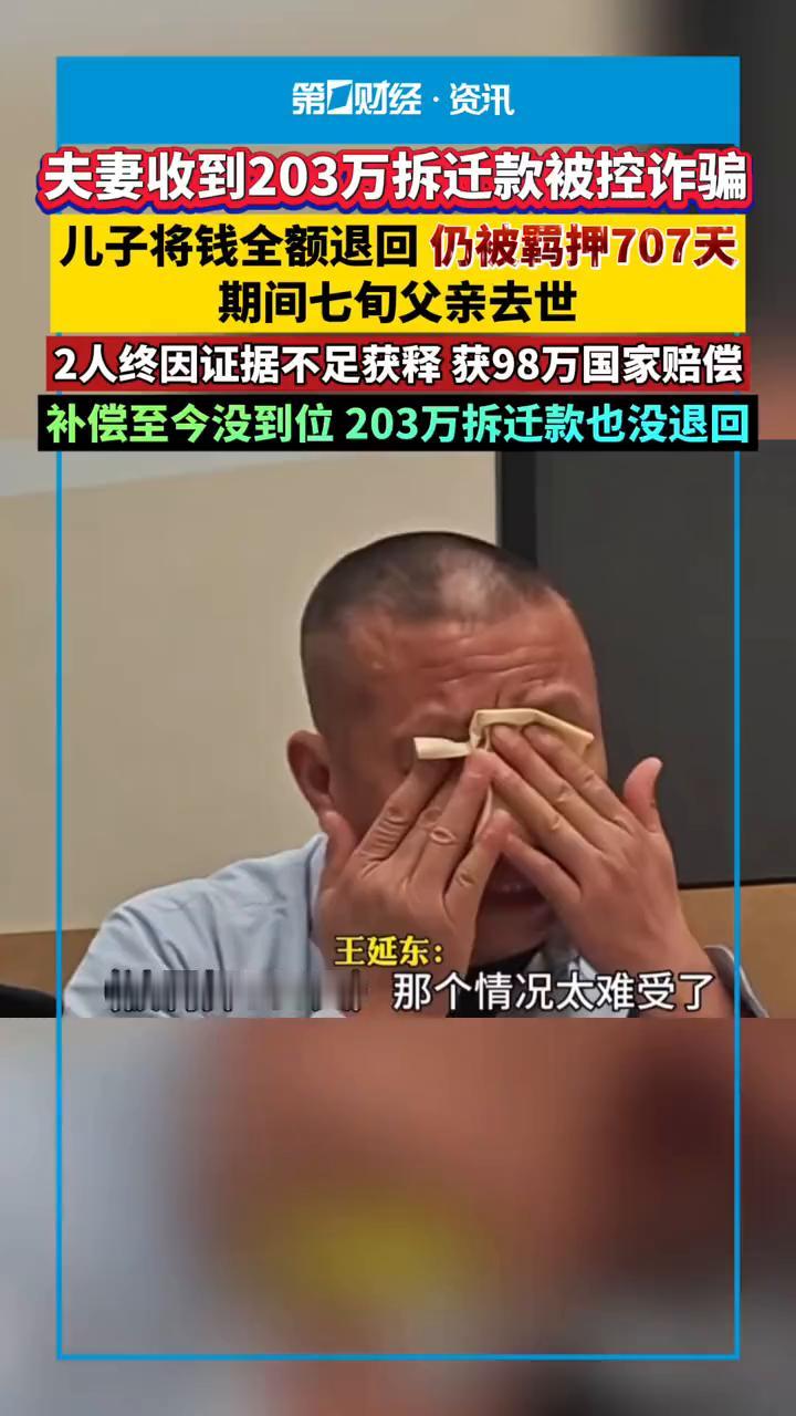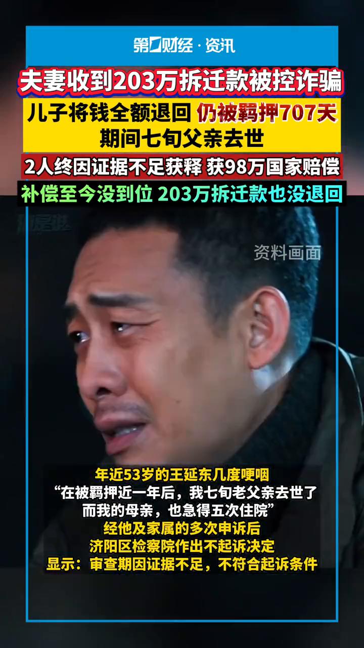 夫妻收到203万拆迁款被控诈骗,儿子将钱全额退回仍被羁押707天,期间七旬父亲去世,2人终因证据不足获释获98万国家赔偿,补偿至今没到位203万拆迁款也没退回。 王延东:(被羁押707天)那个情况太难受了。 近日山东济南市民王延东向华商报大风新闻反映,他与爱人因自家砖厂拆迁的事被人以"瞒报土地"为由指控诈骗,经检察院批准逮捕后被羁押707天,最终因证据不足重获自由。 王延东本是一砖厂老板,他回忆2012年砖厂的1205.41平方米被济南市国土资源局认定违建,同年8月他就缴纳罚款29243元,此后他也认为自己缴纳罚款后再无人管,那地上建筑就合法了。 在看守所受(其他舍友)欺负。 2019年10月,该厂区被纳入拆迁范围,签订协议后他收到203.8万元拆迁补偿款,没想到的是2021年他突然被人以"隐瞒土地骗取拆迁款"为由举报,随后济南市济阳区检察院批"涉嫌诈骗罪"批准逮捕,他与妻子一同被羁押。 年近53岁的王延东几度哽咽:"在被羁押近一年后,我七旬老父亲去世了,而我的母亲也急得五次住院。经他及家属的多次申诉后,济阳区检察院作出不起诉决定,显示:审查期因证据不足,不符合起诉条件。之后检察院赔付夫妻二人979890.16元。 记者询问当地检察院,工作人员称王延东夫妇的赔偿款确实尚未发放完毕,但"一定会予以赔付,而王延东儿子已退还203.8万元拆迁款。济南市起步区一工作人员联系记者称,该笔钱确实因"厂区全部是违建"非法所得,即使"诈骗罪"不存在也无法子以退还。