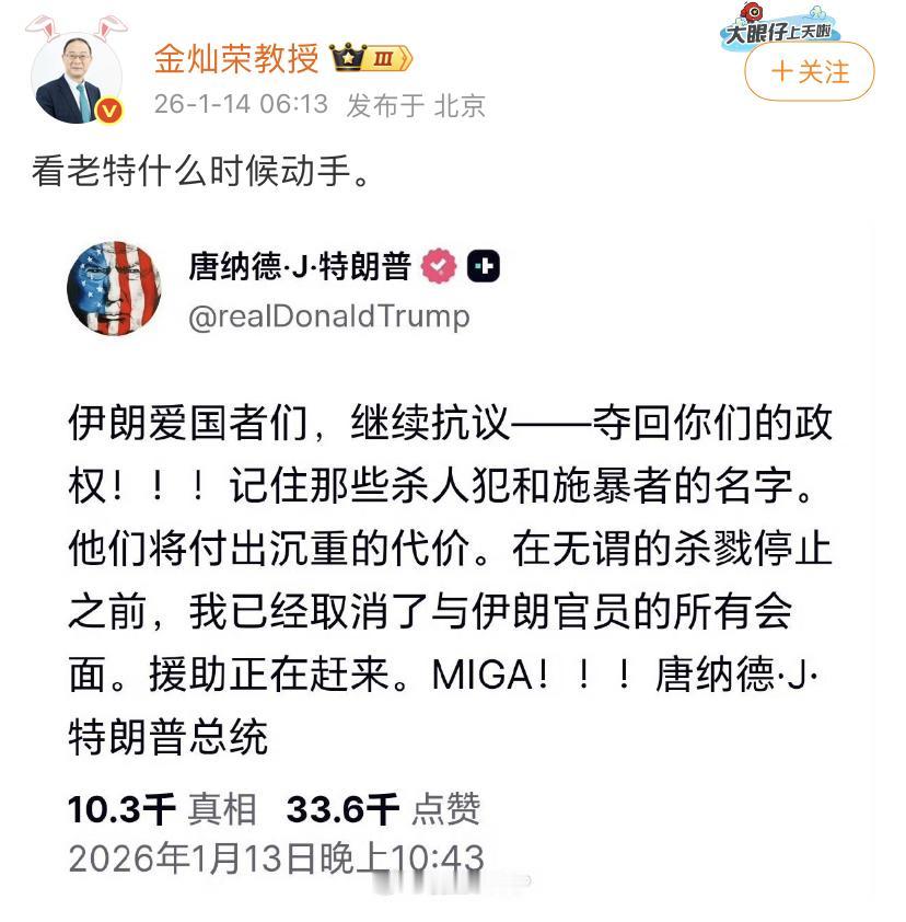 金灿荣教授:看老特什么时候动手。 全世界都认为老特会在近期对伊朗动手,一方面是伊朗的石油确实有相当大的吸引力,另一方面美国需要一个外部的借口来转移国内的矛盾。 对于美国来说,对伊朗动手也是有利可图的,对伊朗动手之后意味着美国在中东的地缘发生了巨大的变化,同时,美国能够收获伊朗的大部分利益。 各位是怎么看的?欢迎评论区留言。
