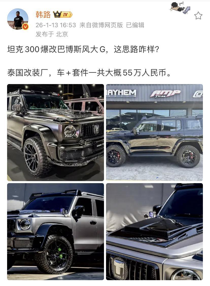 韩路:坦克300爆改巴博斯风大G,这思路咋样? 泰国改装厂,车+套件一共大概55万人民币。 坦克300这款车真的是相当的成功,很多租车公司都有这款车。为什么购买这款车,因为价格合适而且租车的人数还挺多。 同时这款车的后配件开发市场规模非常的大,基本上想改装成什么样的,在网上都可以买得到,也可以找人进行定制。 大家是怎么看的?欢迎评论区留言。
