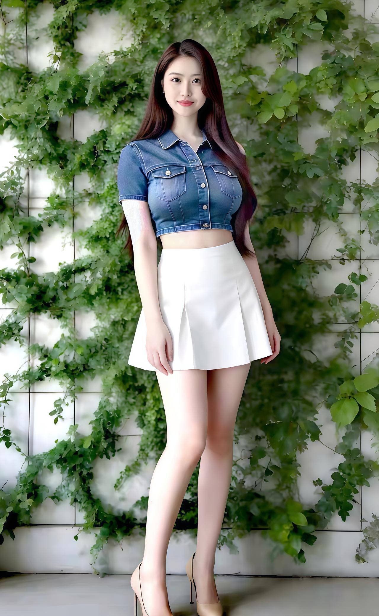 青藤绕壁叠新阴,牛仔裁衣衬素襟。 白褶裙扬风软细,乌丝垂缕影清深。 亭亭立处春痕驻,浅浅颦时晓色侵。 不借繁花添秀色,天然风骨胜瑶簪。