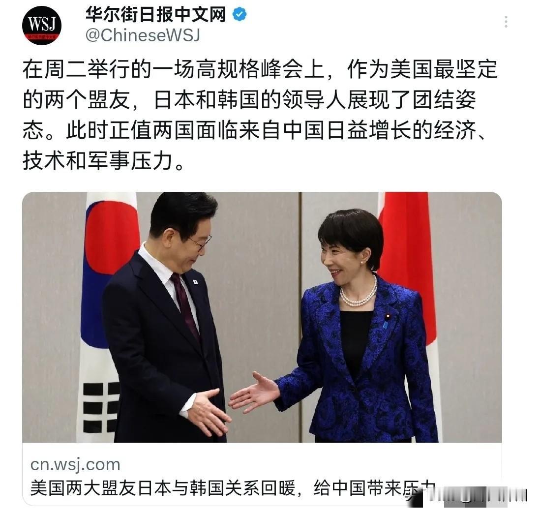 美媒表示,中国很显然不希望这一幕发生,日韩两国正在接近,这给中国带来了压力!1月14日,在李在明访问日本之际,美国华尔街日本刊文声称,在周二举行的一场高规格峰会上,作为美国最坚定的两个盟友,日本和韩国的领导人展现了团结姿态。 此时正值两国面临来自中国日益增长的经济、技术和军事压力。美国两大盟友日本与韩国关系回暖,两国强调了相互合作的重要性,这无疑给中国带来压力。 评几句: 日韩高规格峰会秀团结?不过是绑在美国战车上的自我感动! 美媒炒作日韩高规格峰会展现团结,还妄称两国面临中国多方面压力,这番说辞既暴露了其挑动阵营对抗的险恶用心,也戳穿了日韩所谓“团结”的本质——不过是绑在美国霸权战车上的一场自我感动。 要知道,中日韩三国地缘相近、经济相融,本就该是互利共赢的合作伙伴,而非相互提防的对手。日韩抛开区域合作大局,紧跟美国搞排他性小圈子,一边在军事、外交上抱团站队,一边借美媒之口甩锅中国,说到底,不过是想借美国的庇护谋取私利,牺牲区域经济合作的红利,却全然不顾此举会给东北亚地区稳定埋下多少隐患。 所谓“中国压力”更是无稽之谈,不过是美西方惯用的“威胁论”老套路。真正破坏地区和平稳定的,从来不是主张合作共赢的中国,而是那些动辄搞集团政治、挑动对抗的势力!