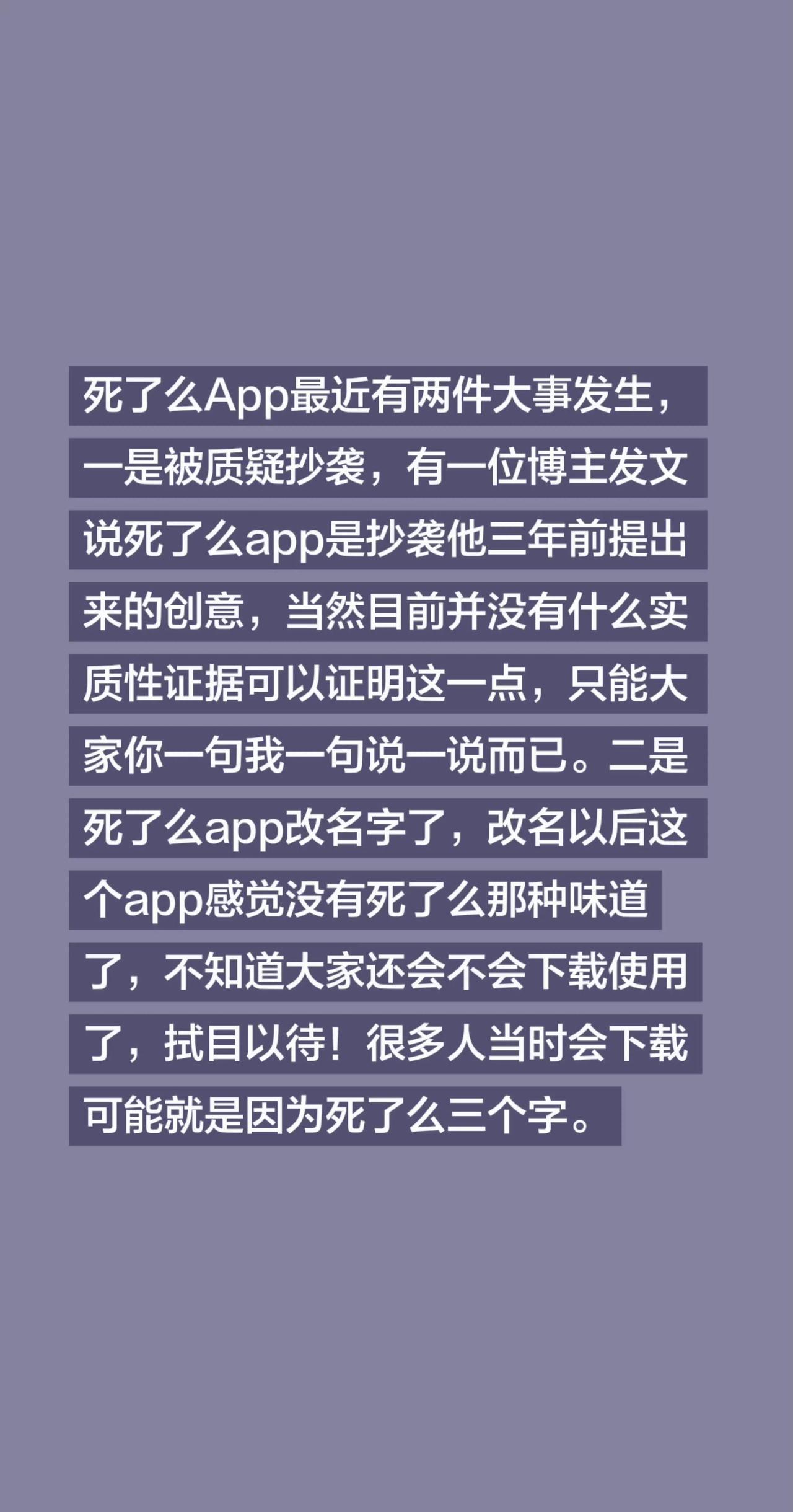死了么App最近有两件大事发生,一是被质疑抄袭,有一位博主发文说死了么app是抄袭他三年前提出来的创意,当然目前并没有什么实质性证据可以证明这一点,只能大家你一句我一句说一说而已。二是死了么app改名字了,改名以后这个app感觉没有死了么那种味道了,不知道大家还会不会下载使用了,拭目以待!很多人当时会下载可能就是因为死了么三个字。