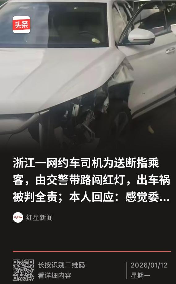 “冤不冤?”浙江,一网约车司机见一乘客手指断了,鲜血直流,情况紧急,而后又见路边有交警执勤,便向交警求助。交警也没有推脱,鸣笛开道,谁料,司机开着跟着交警走到一路口闯红灯时,被一辆私家车撞了。事后,交警认定司机全责。好事变坏事,司机委屈不已,直呼冤枉。 事发当天的晚高峰,浙江的一条主干道上车流涌动,网约车司机像往常一样穿梭在车流中接单。接到订单后没多久,他就赶到了约定地点,上车的乘客一落座,司机就注意到了不对劲。 乘客的右手食指明显断裂,鲜血顺着指尖不断往下淌,染红了手边的纸巾,脸上满是痛苦和焦急的神情,一个劲地催促司机快点往医院赶,说手指断了要尽快做手术,晚了可能就接不上了。 看着乘客伤口不断渗血,司机也急了,立刻加速往最近的医院赶。可晚高峰的路况实在糟糕,车辆只能一点点往前挪,乘客的情绪越来越激动,伤口的出血量也没见减少。 就在司机急得满头大汗的时候,他瞥见路边有交警正在执勤,像是抓住了救命稻草,立刻靠边停车向交警求助,把乘客的紧急情况快速说明。 交警见状,没有丝毫推脱,当即决定鸣笛开道,护送这辆载有重伤乘客的网约车前往医院。随着警笛的尖锐声响响起,前方的车辆纷纷主动避让,原本拥堵的车流让出了一条通道。 司机紧紧跟在警车后面,心里悬着的石头稍稍放下,想着有交警开道,应该能尽快把乘客送到医院。 可谁也没料到,意外就在一个十字路口发生了。当时信号灯已经变红,开道的警车凭借执行紧急任务的优先通行权,顺利驶过路口。 司机紧随其后,想着有交警在前引导,便没有犹豫地跟着闯了红灯。就在他的车刚驶到路口中央时,一辆正常通行的私家车从侧面冲了过来,来不及躲闪的两辆车狠狠撞在了一起。 剧烈的撞击声在路口响起,两辆车的车头都受到了不同程度的损坏,碎片散落一地。网约车司机猛地往前一冲,额头撞到了方向盘上,一阵眩晕感袭来。 他缓过神的第一件事,就是回头查看乘客的情况,好在乘客有安全带保护,除了因撞击受到惊吓,伤口没有进一步恶化。私家车司机也赶紧下车查看,万幸的是双方都没有生命危险。 事故发生后,更多交警赶到现场处理。交警一边安排人员将受伤的乘客送往医院救治,一边对事故现场进行勘查、取证,询问双方事发时的情况。司机原本以为,自己是为了救助紧急病人,还跟着交警开道,就算闯了红灯,责任也不该全在自己。 可当责任认定书下来的时候,他彻底傻了眼——认定结果显示,他需要对这起事故负全部责任。交警给出的理由很明确,警车执行紧急任务时的优先通行权仅适用于警车本身,不能自动转移给跟随的社会车辆。 司机驾驶网约车闯红灯的行为,违反了交通规则,且与事故的发生存在直接因果关系,因此要承担全部责任。 这样的结果让司机难以接受。他想不通,自己明明是为了救人,还得到了交警的开道协助,怎么最后反倒要独自承担所有责任。 车辆维修费用、给对方私家车的赔偿,再加上事故处理期间车辆停运的损失,一笔笔开销让他压力倍增。更让他委屈的是,自己的善意救助不仅没得到肯定,反而惹上了麻烦,心里的憋屈无处诉说。 这起事件曝光后,迅速引发了全网热议。有网友觉得司机很冤,他的出发点是救人,而且是跟着交警开道才闯的红灯,不应该让他独自担责; 也有网友表示理解交警的认定,交通规则是底线,不能因为救助行为就随意突破,否则容易引发更多交通混乱。还有人关注到,类似的紧急救助场景下,如何平衡善意与规则的问题,一直是大家争论的焦点。 毕竟在紧急情况下,救人是本能,可交通规则的刚性约束也不能忽视。如何让善意施救者不用再担心“好心没好报”,在守护生命的同时也能得到规则的包容,这不仅需要更细致的执法考量,或许也需要更完善的保障机制来兜底,让见义勇为者敢为、有为,没有后顾之忧。 对此,你们有什么看法,欢迎评论留言~