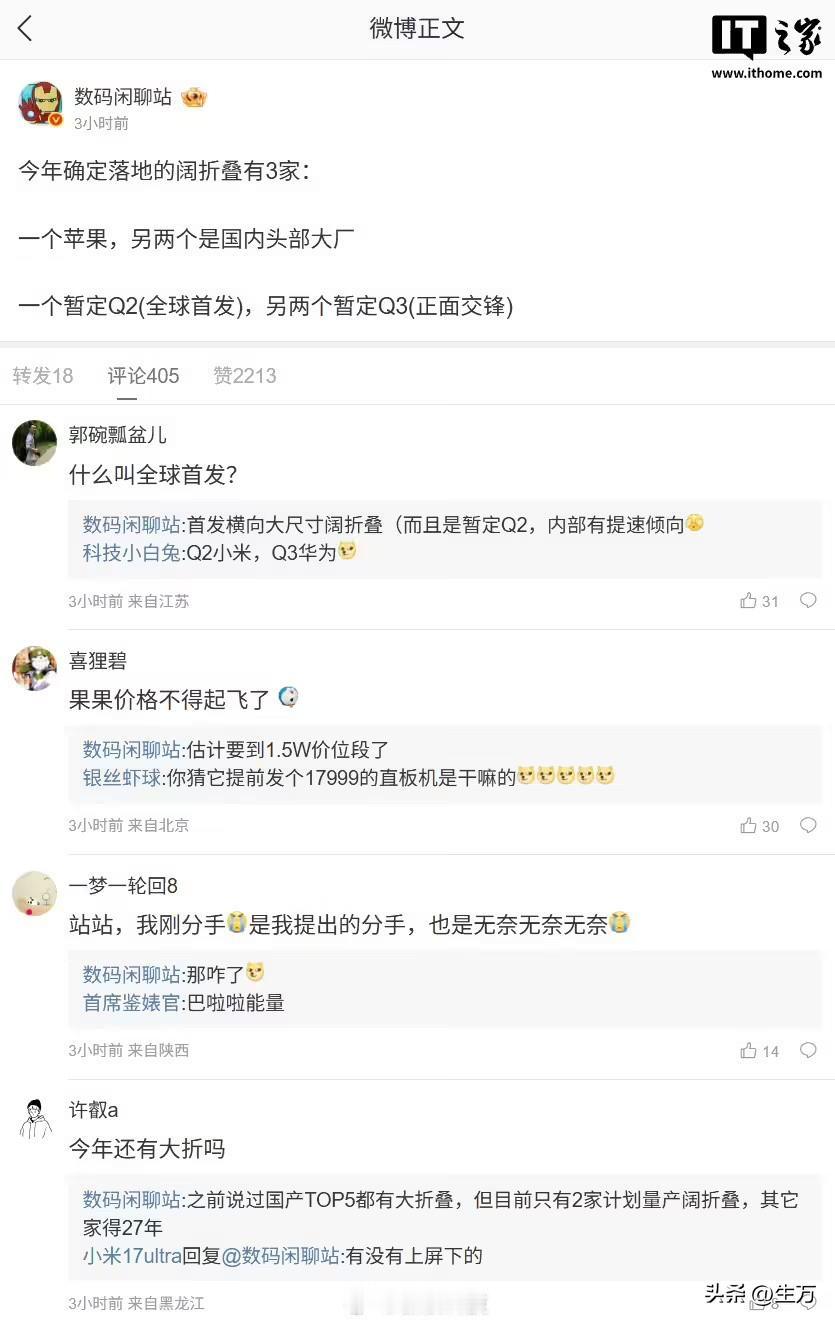 全是自研:曝小米阔折叠9月发布! 就在刚才,数码博主放出了小米有可能在八个月之后,正式的发布他们的阔折叠,所以之前所有的手机包括小米17系列不一样的地方在于,有三大块全部都是自己研发的。 简单地说就是他的屏幕芯片和整个系统,实现了百分之百的练小米自己研发,所以这个手机的意义,目前小米在市面上发售的全部手机都不一样,因此很多人更加关心的是这个手机的价格怎么样。 毕竟目前市面上有的主流品牌的阔折叠手机,整个价格都不便宜,但是这个手机的消费群体,相比系列旗舰手机来说,并不是特别主流的,所以小米对这个手机的定位以及定价就显得尤为重要了。 目前根据同行类似的型号,手机价格来看,手机的价格相对来说比较高的价格,比系列期间都要贵,所以小米要怎么做到去吸引这部分目标客户,确实还是有点考验水平的,毕竟华为也出过这种手机,而且价格也不便宜,但目前这个手机在整个华为数字系列和旗舰系列之间,卖得并不是特别靠前。 要说产品力和品牌力,华为的这款手机都算得上是优秀的,但是他为什么没有卖过自己的系列型号,可能与这个手机本身的需求市场还是有关的。 到时候我们看看小米最终要如何来定价,也不知道他的价格区间到底在哪个范围,如果他最终定到一个同行都没有的价格,那么这个手机卖得比较好也是有可能的。