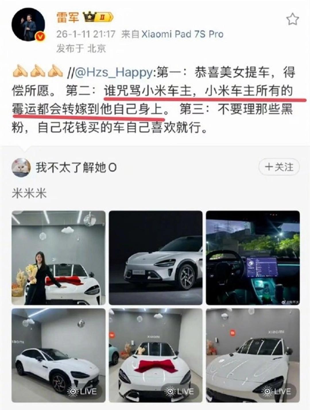 雷军转发“诅咒贴”护车主,删了!这波操作到底掉不掉价? 这事儿得从1月11日说起。那天雷军刷微博,看到一位小米YU7车主晒提车照,评论区有条留言火了:“谁咒骂小米车主,小米车主所有的霉运都会转嫁到他自己身上。” 雷军二话不说,直接转发,还配了三个拱手礼表情。 这一转可不得了,24小时内话题阅读量破8亿,评论区直接上演“魔法对轰”。支持者拍手叫好,说雷总终于硬气了;反对者跳脚骂街,说企业领袖转发这种诅咒式内容太掉价。 但你们知道吗?这事儿背后藏着小米被黑惨了的真相。小米副总裁李肖爽在直播里讲过一个真实案例:一家三口提车分享幸福时刻的视频,评论区竟然涌进来4万多条整齐划一的诅咒和谩骂。这哪是正常用户行为?分明是水军有组织攻击。 雷军自己也说,这些尬黑让他有心理阴影了,现在讲每句话都得想了又想。1月7日,他直接宣布终止与攻击小米用户的KOL“万能的大熊”合作,还对内部团队重罚。 所以你说雷军转发这个“诅咒贴”是信玄学?我看未必。他是在用网络梗的方式告诉那些黑子:别欺负我的人。 不过有意思的是,没过多久,这条转发就被雷军删了。有人说他太小心,有人说他意识到不妥。但不管怎样,这波操作确实把小米从沉默推向了主动。 2025年小米汽车交付超41万辆,成绩不差,但舆论压力如影随形。从“绿化带战神”标签到各种事故视频被恶意剪辑传播,小米被黑得够呛。 现在雷军选择站出来,用这种略带情绪化的方式为车主发声,你说他掉价吗?我倒觉得,在用户被网暴的时候,企业负责人能站出来说句“我挺你”,比什么都强。 当然,作为公众人物,转发这种内容确实容易引发争议。但换个角度想,当理性讨论被情绪海啸淹没时,企业还能继续“专业克制”吗? 这事儿让我想起一句话:网络不是垃圾场,谁乱倒脏水,迟早把自己淹了。小米这波操作,至少让那些黑水军知道,不是所有企业都会忍气吞声。 至于雷军删不删帖,我觉得不重要。重要的是,他让那些被网暴的车主知道,他们不是一个人在战斗。