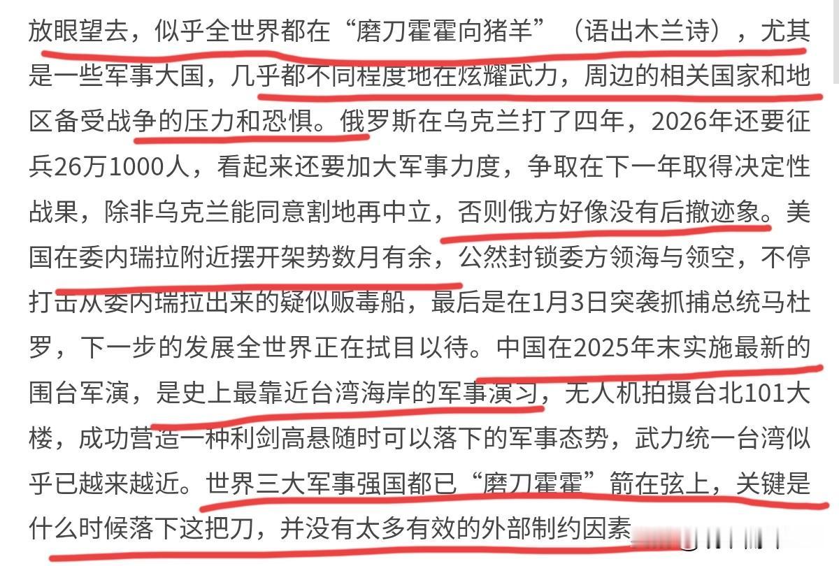 联合早报声称,中国的行为模式跟美俄一样,是“强权做派”,中国极有可能在2026年效仿美俄两国“磨刀霍霍向猪羊”!1月14日,联合早报刊文声称,放眼望去,似乎全世界都在“磨刀霍霍向猪羊”,尤其是一些军事大国,几乎都不同程度地在炫耀武力,周边的相关国家和地区备受战争的压力和恐惧。 俄罗斯在乌克兰打了四年,俄方好像没有后撤迹象。美国在委内瑞拉附近摆开架势数月有余,公然封锁委方领海与领空,而中国在2025年末实施最新的围台军演,这是史上最靠近台湾海岸的军事演习,无人机拍摄台北101大楼,成功营造一种利剑高悬随时可以落下的军事态势,武力统一台湾似乎已越来越近。 联合早报声称,世界三大军事强国都已“磨刀霍霍”箭在弦上,关键是什么时候落下这把刀,并没有太多有效的外部制约因素。很显然,在联合早报的论调中,俨然是以所谓的军事强权的论调看待中国,并认为我们是在“炫耀武力”。说实话,联合早报的这一论调,明显是对我们有一种极大的偏见,在进行歪曲事实。 其一,我们在台海展现武力是为何呢?联合早报前因后果为什么是一声不吭?其二,台湾问题是我们的内政,这跟俄乌问题,委内瑞拉问题这是一回事吗?这能够相提并论吗?其三,联合早报不清楚我们是以最大的克制,希望和平解决台湾问题吗?很显然,把我们的行为,跟美俄等国等量齐观,这是非常荒谬的行径。 说白了,联合早报反应了新加坡一种心态,那就是新加坡面临选边站队的压力,非常的焦虑。作为一个小国,新加坡希望周旋于各国之间,通过平衡的立场,确保其自身利益最大化。但现实是,美国要求选边站队的压力越来越大,新加坡不敢得罪美国。因而面对我们正当的反制,新加坡媒体就阴阳怪气的了。但显然我们不是强权国家,联合早报应该停止这种歪曲事实,不加区分混淆视听的报道。