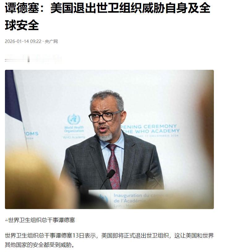 世界卫生组织总干事谭德塞13日明确表态,美国即将正式退出世卫组织。 谭德塞在新闻发布会上直言,这一决定会让美国和世界其他国家的安全都受到威胁,对双方而言都是一种损失。他强调这并不是一个正确的决定,希望美国重新考虑并重返世卫组织。 谭德塞指出,世卫组织开展的许多工作都对美国有利,“如果不与世卫组织合作,美国就无法确保自身安全”。谭德塞还表示,通过预算调整和结构改革,世卫组织正逐步解决资金问题。 很多人可能没意识到,美国这次退出不是临时起意,也不是单一事件。根据公开信息,美国正式退出世卫组织的时间定在2026年1月22日,距离谭德塞表态仅剩下9天。 这一决定的源头要追溯到2025年1月20日,当天特朗普政府刚重返白宫就签署行政令,宣布退出世卫组织并暂停所有资金支持。按照世卫组织章程,成员国提交退出申请一年后才能正式生效,这才有了眼下即将落地的退出结果。 谭德塞反复强调的“安全威胁”,绝非空穴来风。世卫组织的核心职能之一就是搭建全球卫生安全网络,194个会员国通过这个平台共享疾病监测数据、协同应对突发公共卫生事件。美国退出后,这个网络会直接出现缺口。 世卫组织在全球有150多个实地办事处,这些机构实时跟踪流感、禽流感等传染病的传播态势,美国此前一直是这些数据的直接受益者。失去这一信息渠道,美国对跨境疾病威胁的预警能力会明显下降。 全球层面的影响更直接,过去几十年,美国一直是世卫组织的最大资助国,2022-2023双年度贡献了12.84亿美元资金,这些资金支撑着世卫组织的应急响应、疫苗研发等关键工作。 美国退出前就已拒缴2024和2025年的评定会费,直接导致世卫组织面临5.6亿至6.5亿美元的预算缺口。虽然谭德塞提到通过预算调整和结构改革解决资金问题,但世卫组织已被迫启动裁员重组,总部高级管理团队从12人缩减至7人,部门数量从76个减至34个,部分高收入国家的办事处也将关闭。 这些削减会直接削弱全球应对卫生危机的能力。世卫组织主导的脊髓灰质炎 eradication项目,美国一直是核心合作伙伴,双方的协作有效阻止了这种可预防疾病的全球复燃。美国退出后,相关资金和技术支持会中断,疫情监测和疫苗分发工作都会受影响。 更关键的是,任何全球性传染病都不会受国界限制,新冠疫情已经证明,单个国家再强大也无法独自构建安全防线。美国退出世卫组织,相当于主动打破全球卫生协作的链条,最终只会让自身和其他国家都暴露在更高的健康风险中。 美国政府给出的退出理由是“世卫组织未能实施急需改革”“会费分摊不公”,但这更像是单边主义的借口。事实上,美国的“退群”行动早已形成轨迹,本次退出世卫组织只是其中一环。 2025年重返白宫后,特朗普政府密集退出多个国际组织,1月20日当天就同时退出世卫组织和《巴黎协定》,后续又陆续退出联合国人权理事会、联合国教科文组织等机构。这种以“美国利益”为唯一标准的单边行为,本质上是对多边合作体系的破坏。 国际社会对这一决定的反对声音从未停止。联合国秘书长发言人迪雅里克明确表示,解决全球卫生问题的唯一办法是会员国通过世卫组织平台合作应对。美国国内也有不少批评声音,前卫生与公众服务部部长哈维尔·贝塞拉直言退出是“罪恶”和“短视行为”,因为疾病不会受国界限制。 卫生领域的专家普遍担忧,美国退出会让国际社会在防治疟疾、艾滋病、结核病等疾病上取得的进展出现逆转,还会阻碍根除脊髓灰质炎、监测禽流感的努力。 谭德塞强调“如果不与世卫组织合作,美国就无法确保自身安全”,这句话戳中了核心。世卫组织构建的全球卫生安全体系,本质上是各国相互保障的网络。美国作为全球医疗资源最丰富的国家,看似能依靠自身力量应对卫生危机,但跨境疾病的传播速度远超想象,没有全球层面的监测和协作,任何国家都无法独善其身。 世卫组织推动的全球儿童癌症药物获取平台、疫情早期预警系统等工作,美国都是直接受益者,这些协作带来的安全保障,无法通过单边行动替代。 现在距离美国正式退出还有不到十天时间,谭德塞的呼吁仍在等待回应。全球卫生安全从来不是单个国家的事,多边合作才是应对共同挑战的唯一出路。美国的退出决定,不仅会让自身失去全球卫生协作的红利,还会给全球卫生安全带来难以预估的风险。国际社会普遍期待美国能重新考虑,回到多边协作的框架中来,毕竟在疾病面前,没有任何国家能成为孤岛。