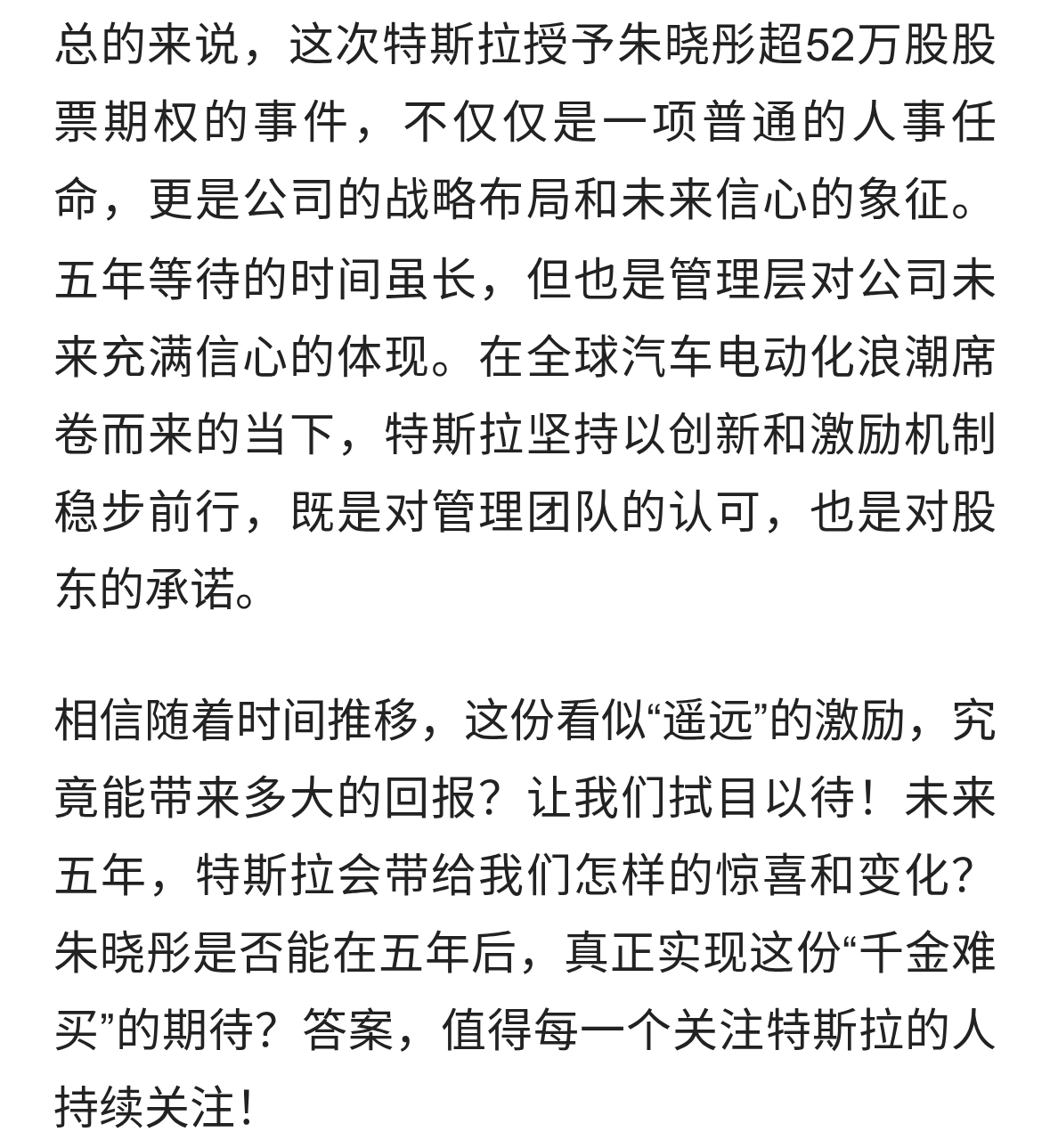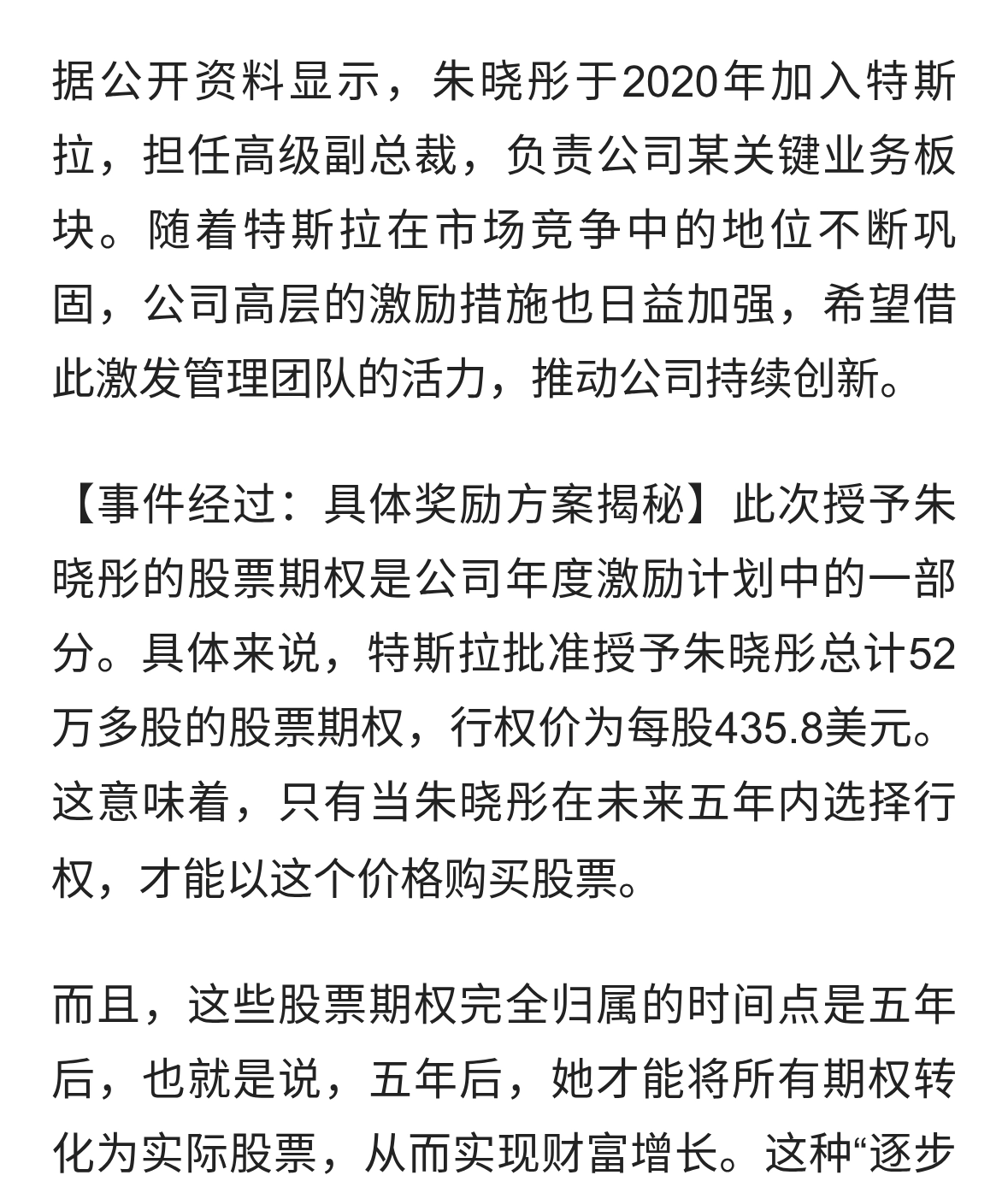 特斯拉授予中国区副总裁朱晓彤52万股期权,行权期限是5年后,行权价格4...